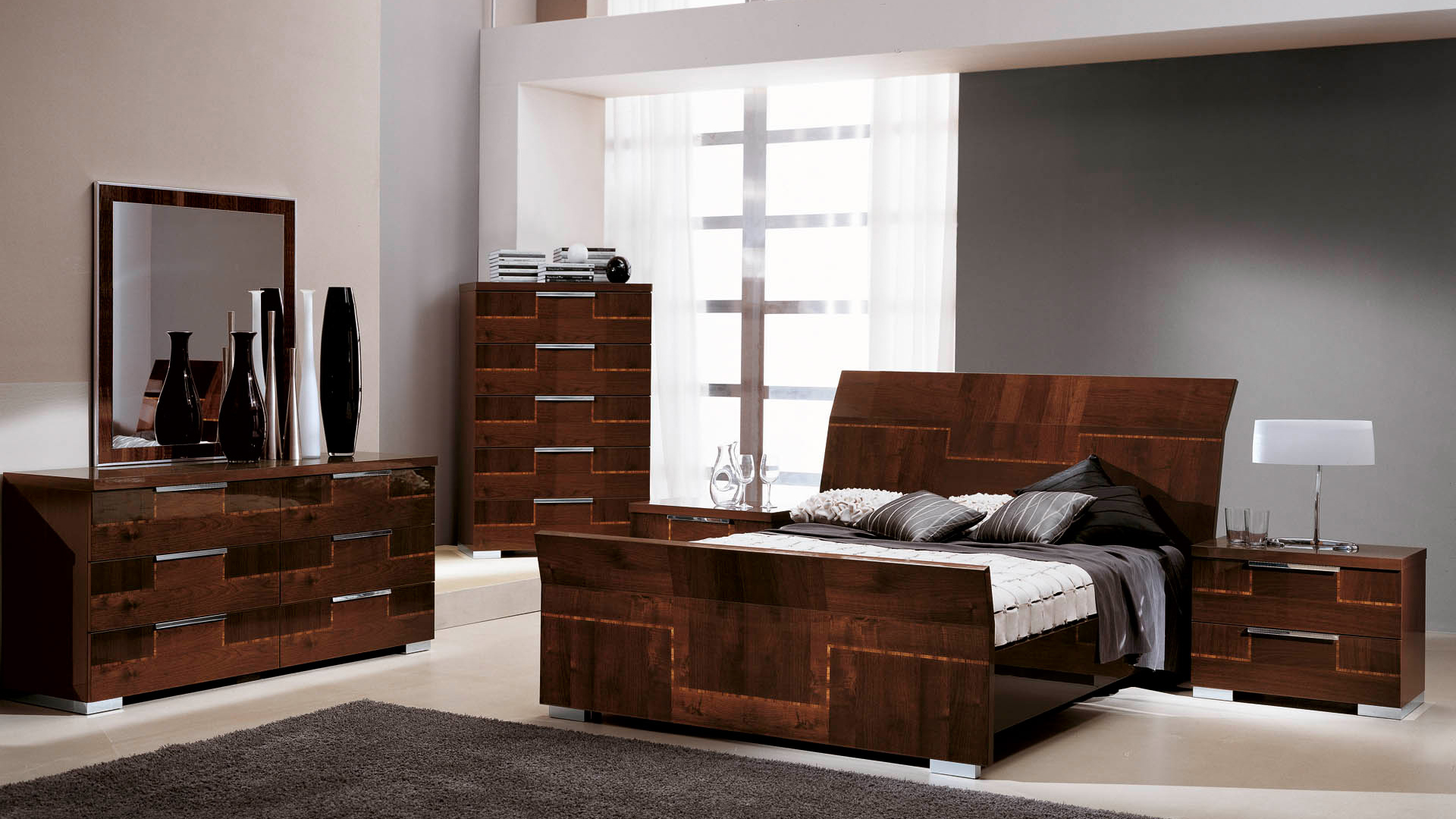 Featured with a supple shape of the headboard the Pisa bed cannot be unnoticed. The entire bedroom collection is made in a gorgeous Walnut Canaletto-Zebrano High Gloss finish that creates a warm and cozy environment in your interior. Case goods of the Pisa bedroom: nightstands, dresser, chest, and mirror - are all decorated with metal profiles and straight handles that create an engaging geometric pattern.