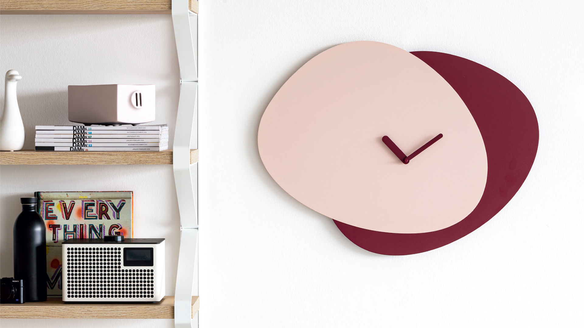 Allora is a wall clock that is impossible to ignore and, with its fuss-free design, it will sweeten even the most frenetic mornings. Made of two overlapping pieces of metal, Allora encapsulates the native beauty of water-paint splashes on a canvas or the spontaneous energy of a hand sketch.