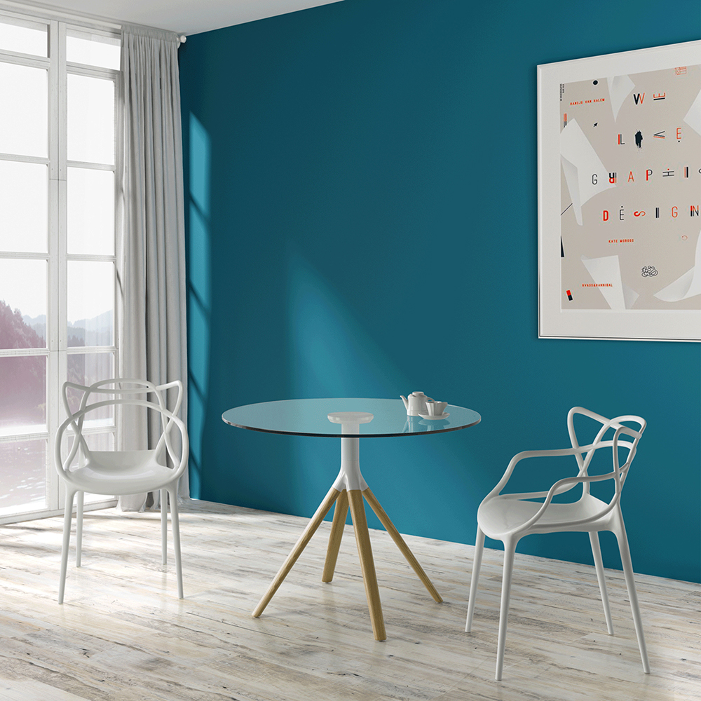 Designer Round Dining Table with 12 mm tempered glass top, metal frame and solid ashwood legs.