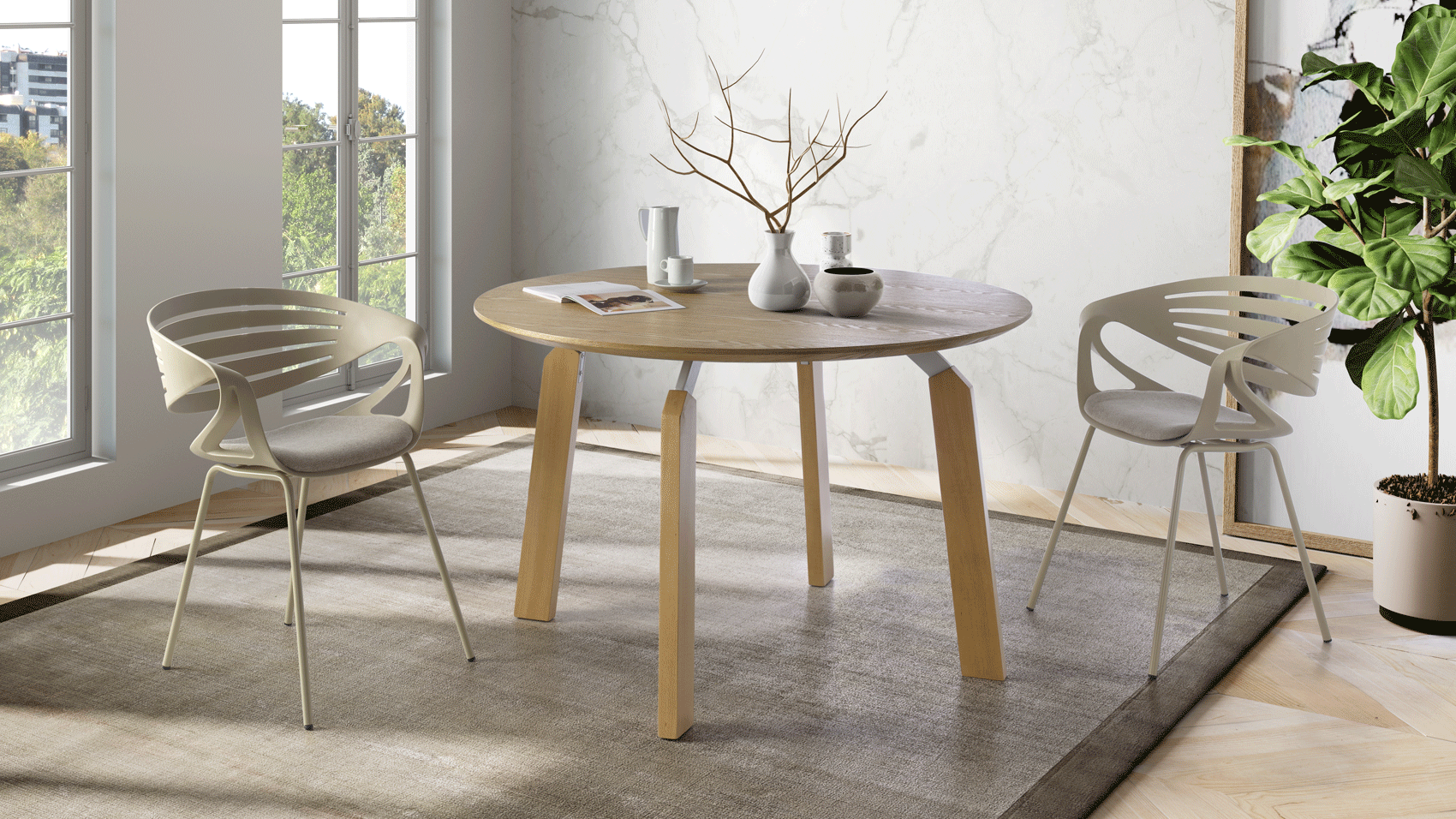 Designer Round dining table top ashwood veneered, metal frame and solid ashwood legs.