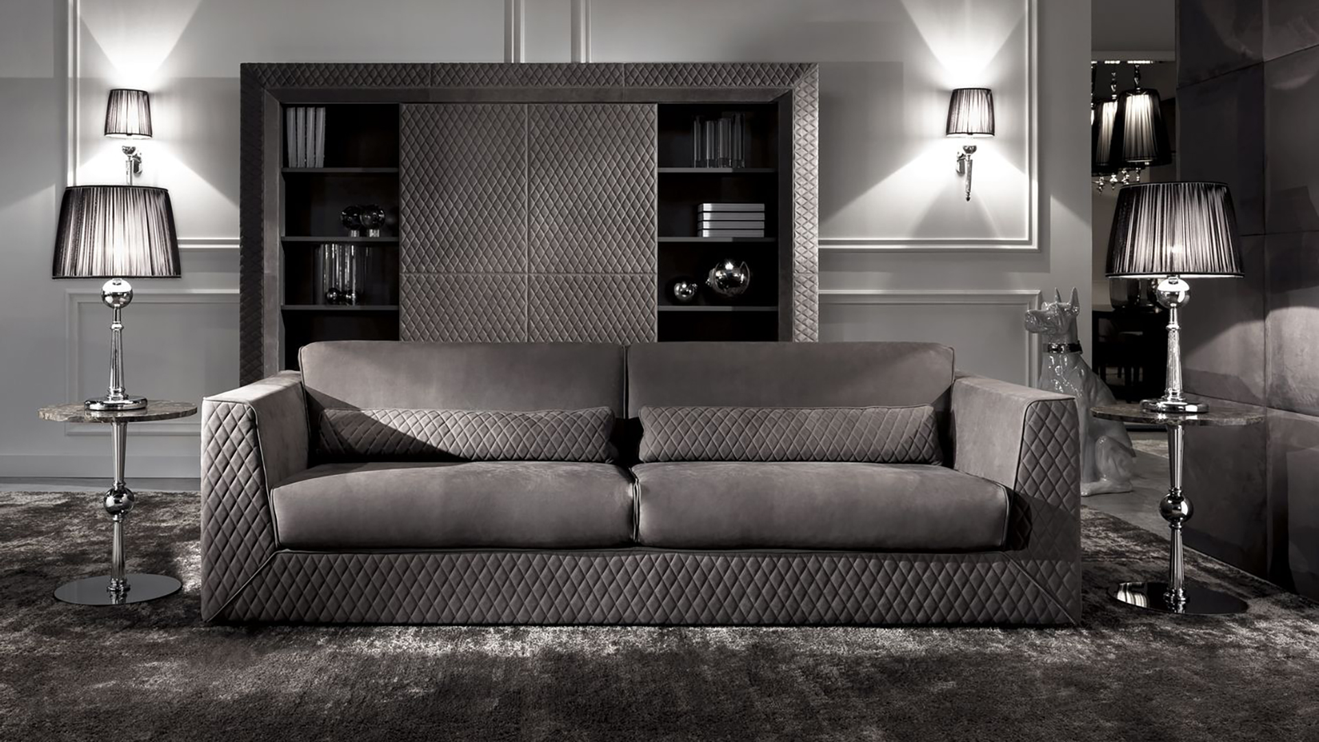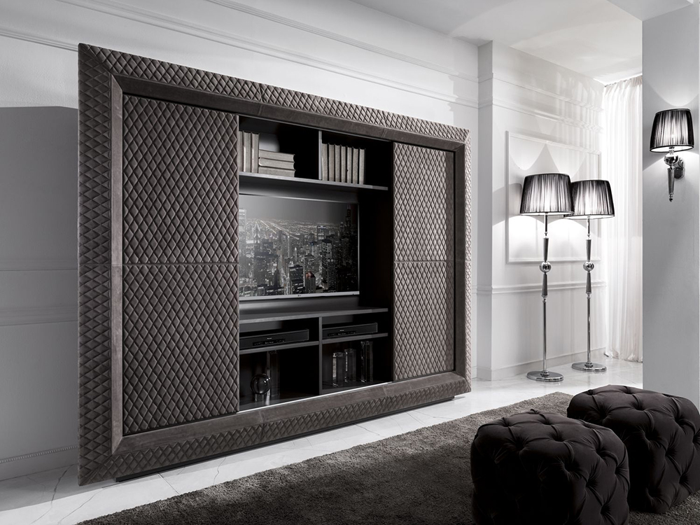 Wall with open shelves, sliding doors and a niche for TV. The frame and doors are upholstered in leather and decorated with quilted stitching. Other finishes and upholstery options are available.