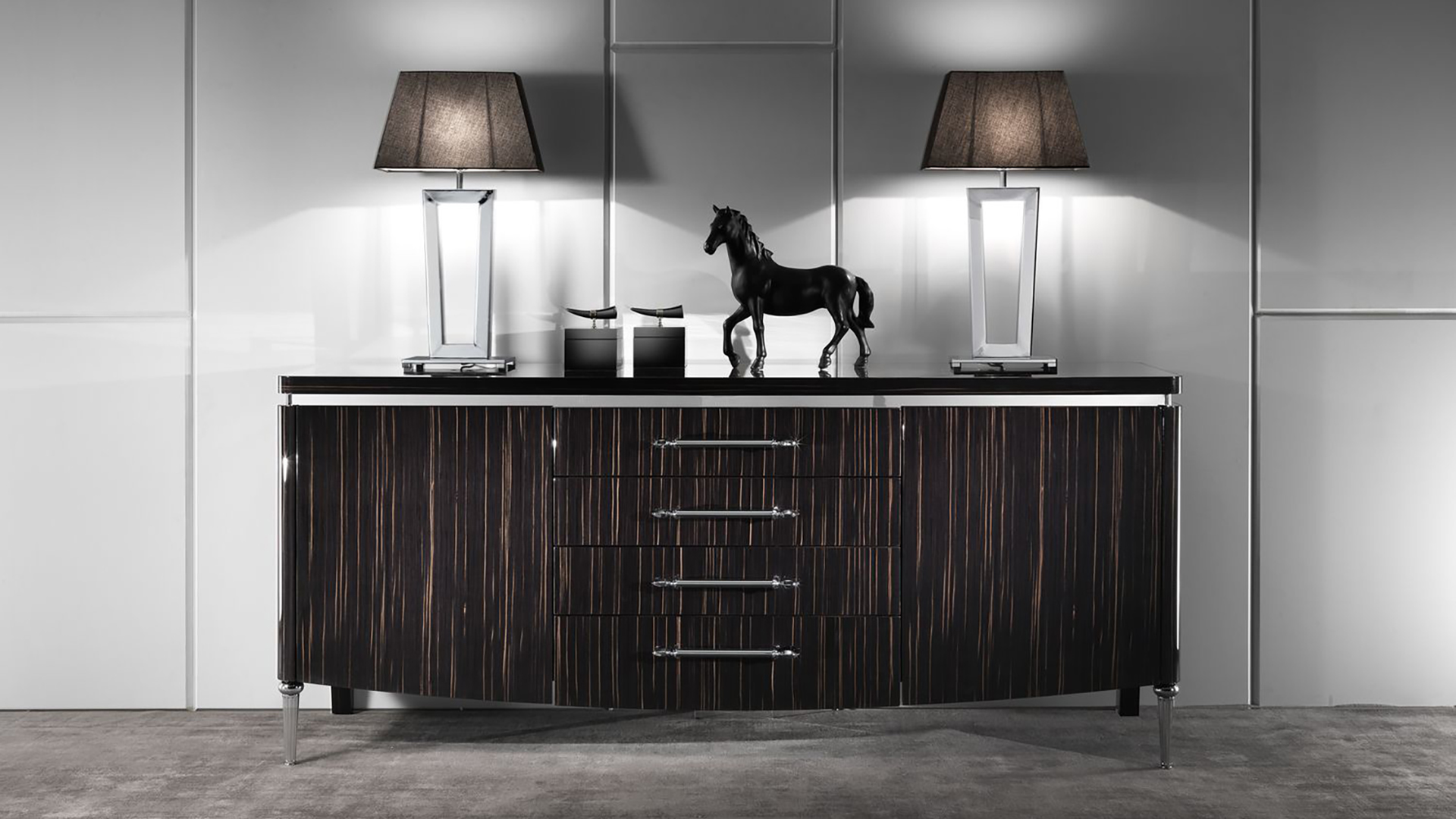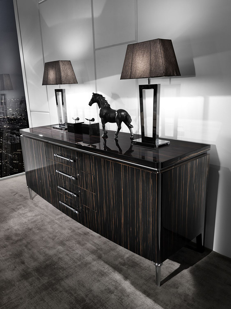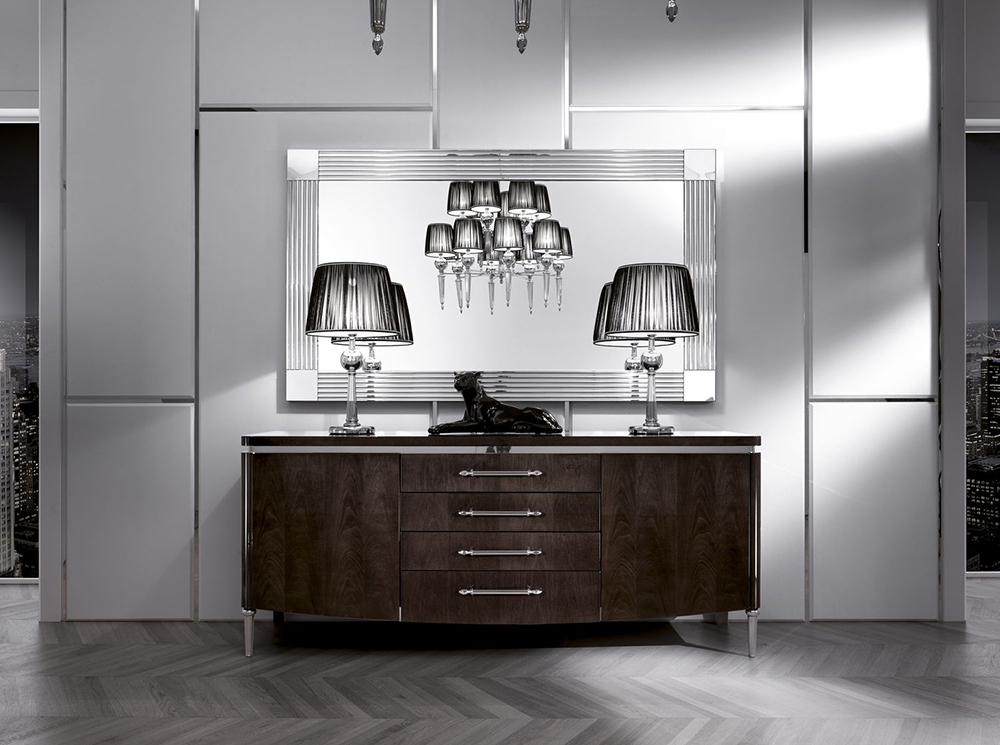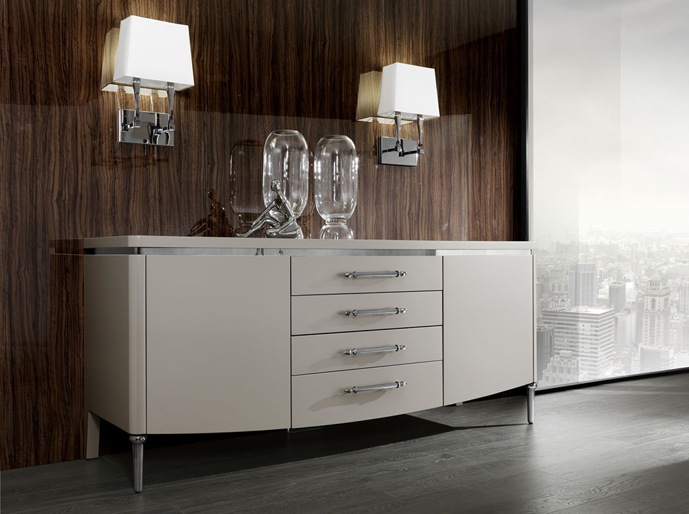 Sideboard with two hinged doors and four drawers. The legs are made of metal. Other finishes are possible.