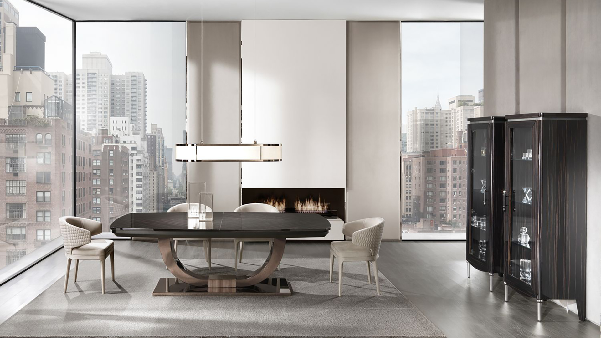 Extensible table on a stainless steel base. The tabletop can be made of different types of wood (in MDF and solid wood) and marble. Other finishes are possible.