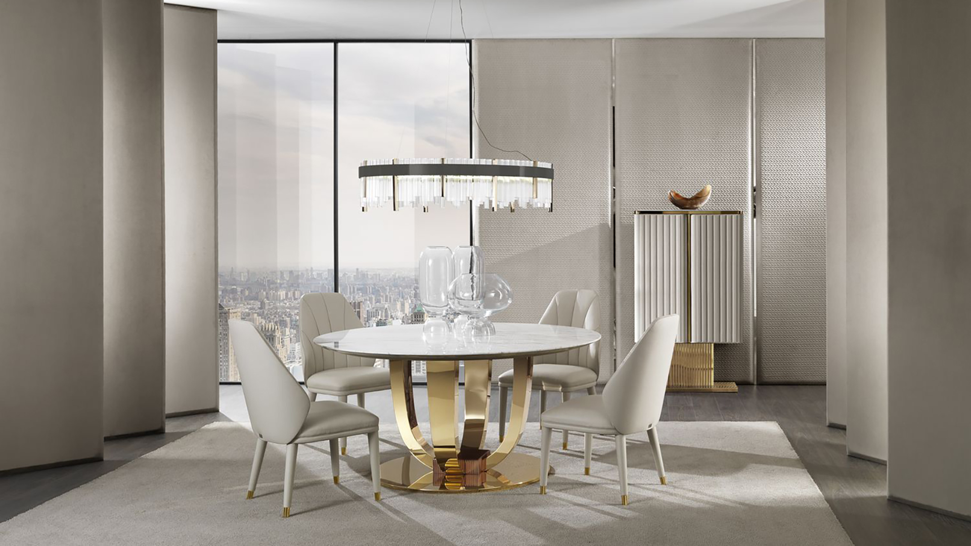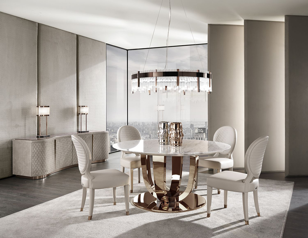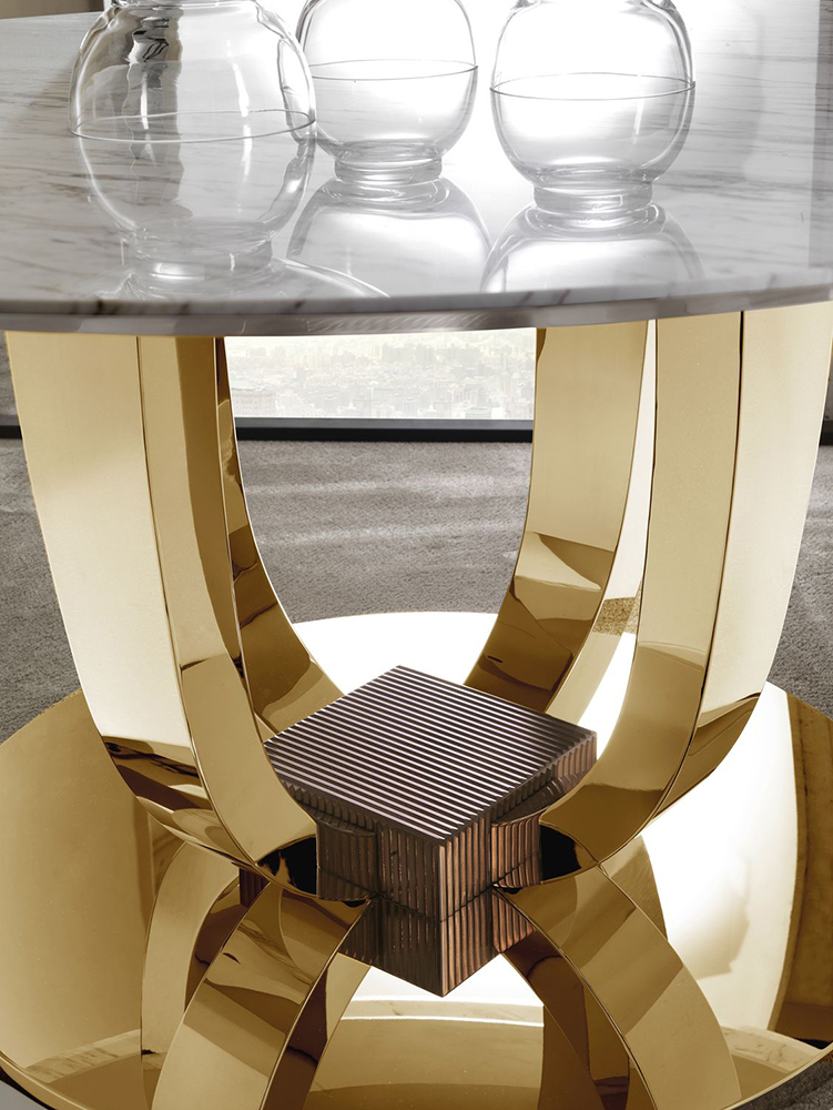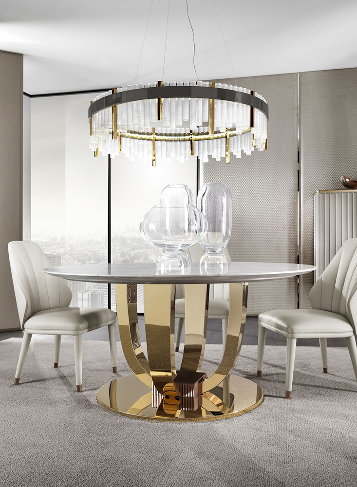 Dining table Hermes is a collection model for executive living rooms. Its main element is a round tabletop made of marble slab. Visually, it is supported by a shiny round base made of durable metal. The decoration of the table are two parabolic legs, cross-connected into one common structure.
