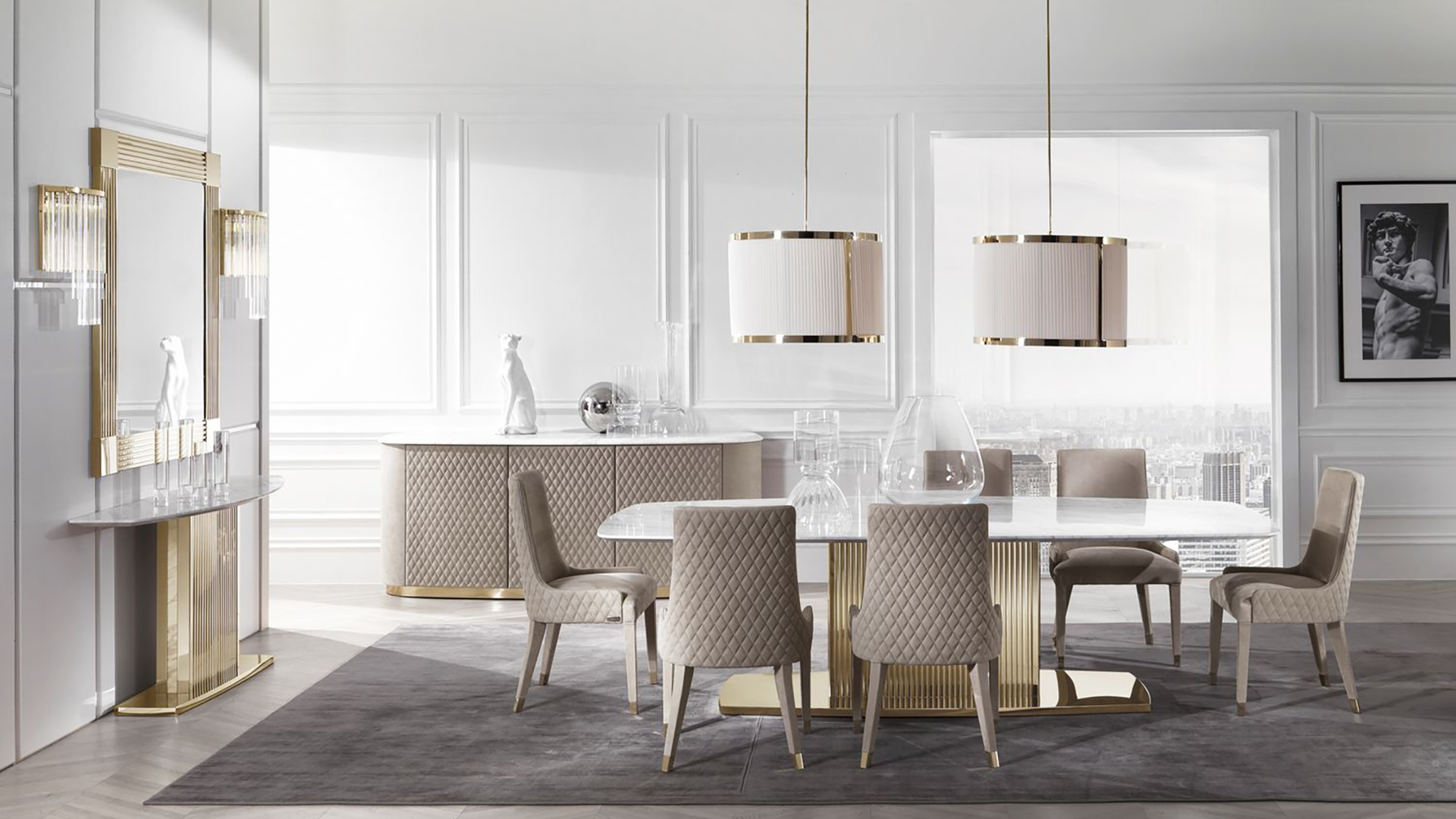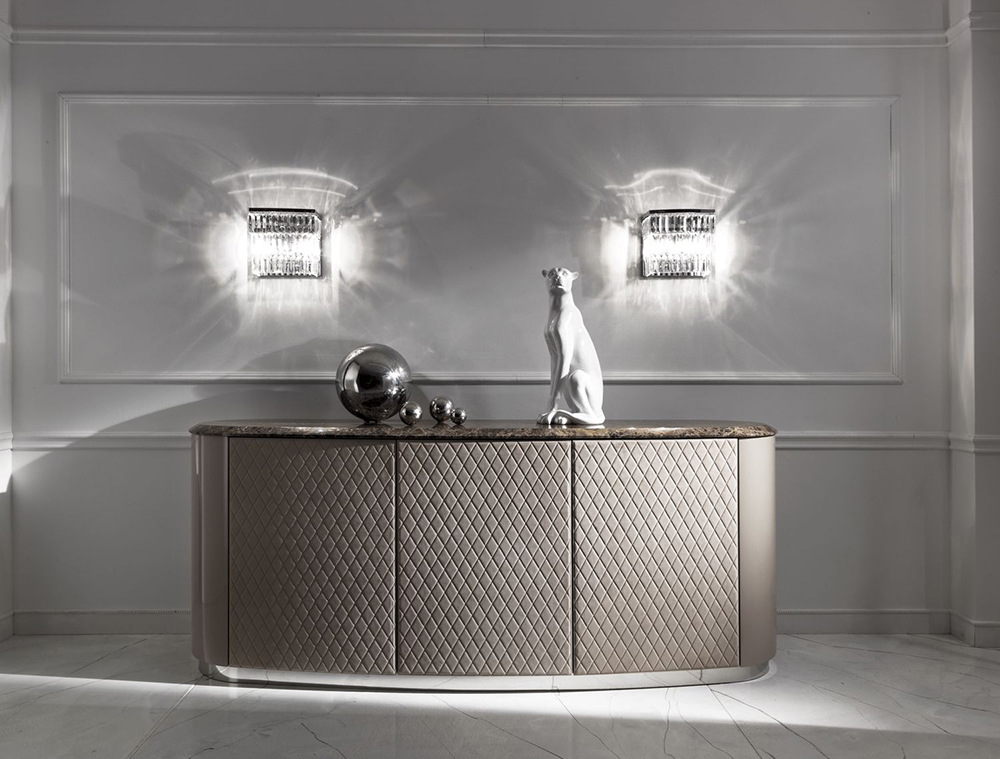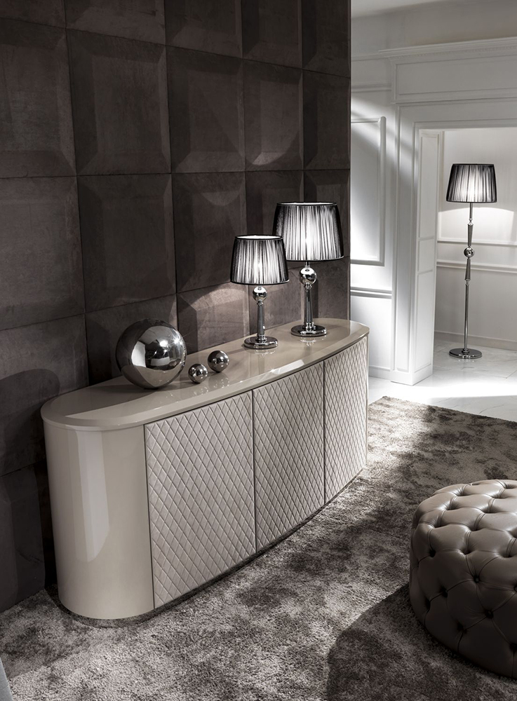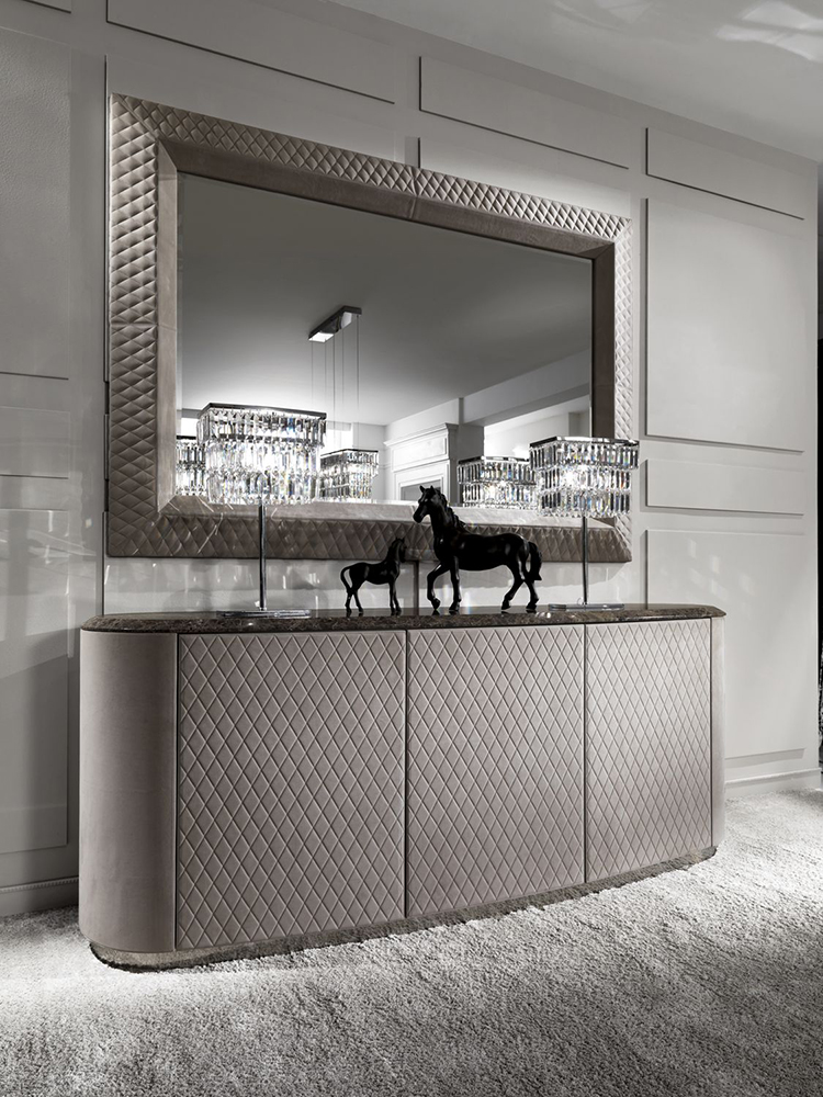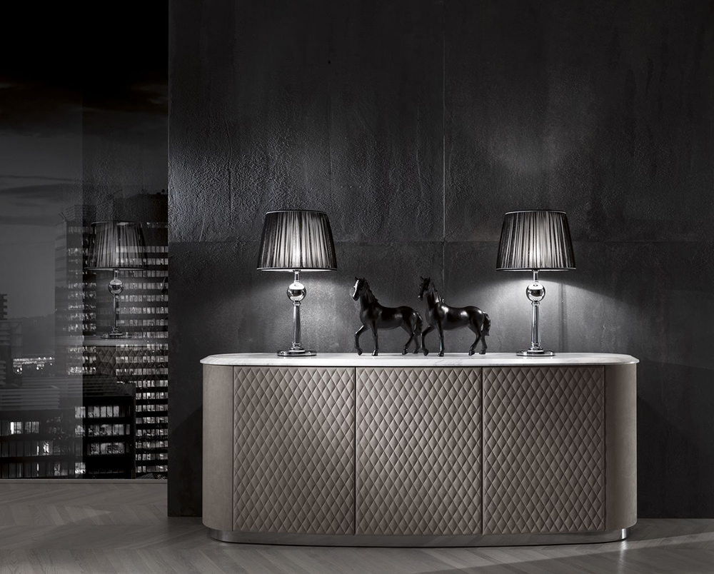 Sideboard with three hinged doors in leather upholstery. The base is made of metal. Sideboard with marble top available. Other finishes and upholstery options are available.