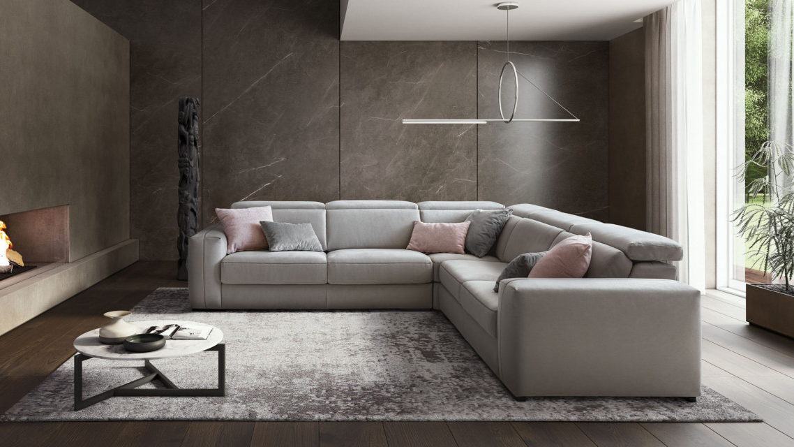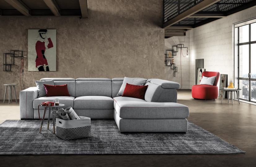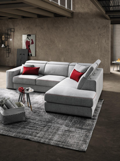 Energetic unison of connecting geometries, Astor is a particular combination of sliding seats and an adjustable headrest designed to mimic the depth of the lateral chaise longue, while an unexpected zig zag seam livens up the armrest.