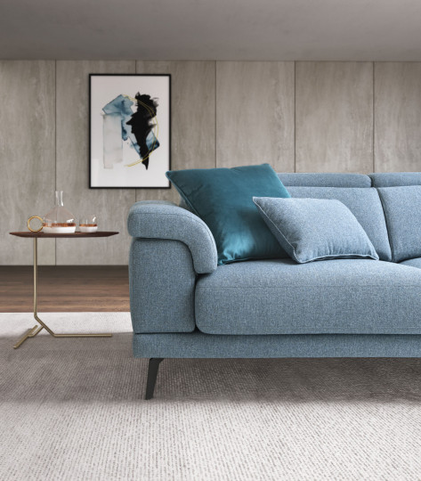 Imagining the living room as an oasis of peace and quiet is easy with Norton. This large fabric sofa finds the perfect balance in the movement of its elements. Sliding seats and reclining headrests become synonyms of relaxation.