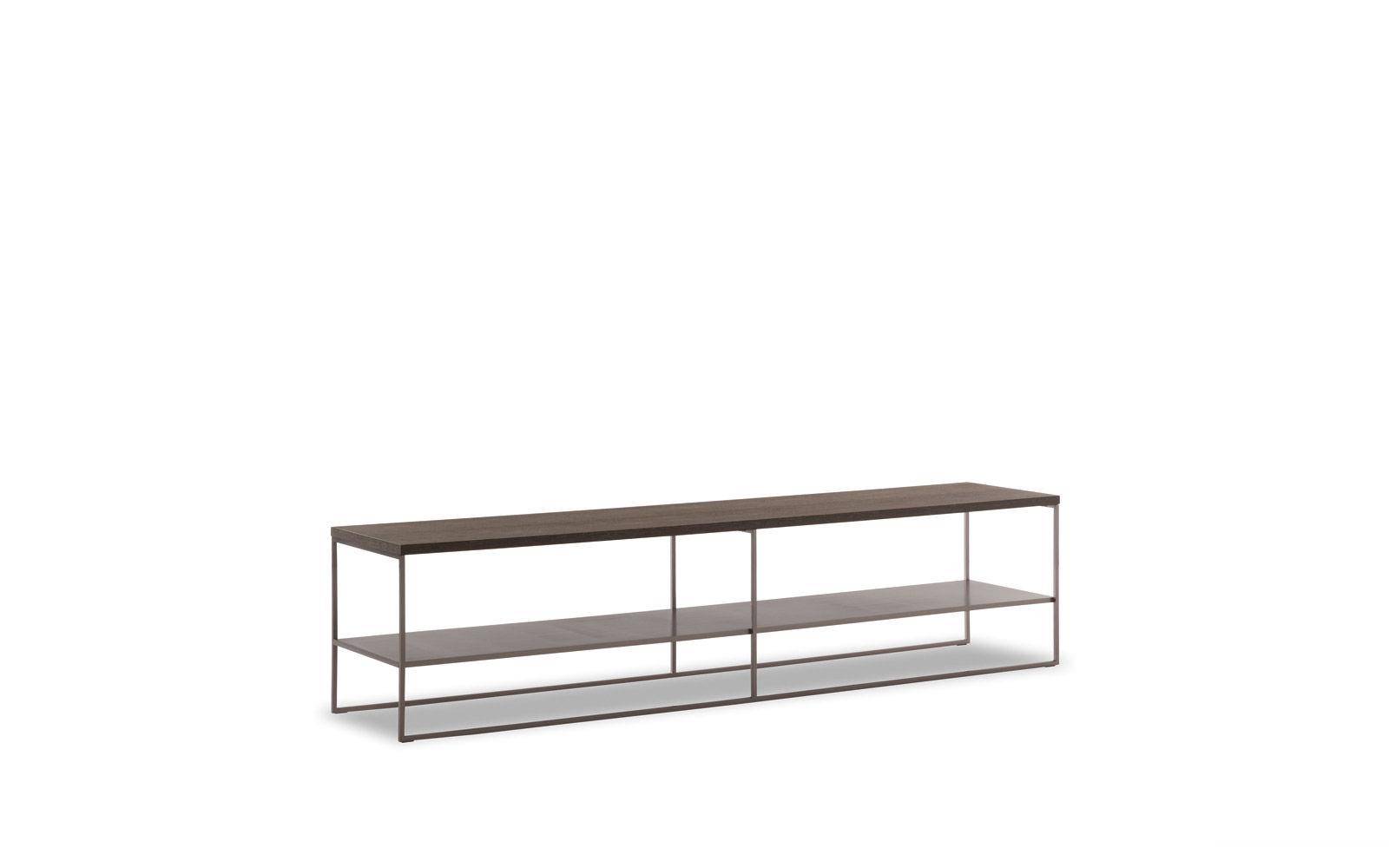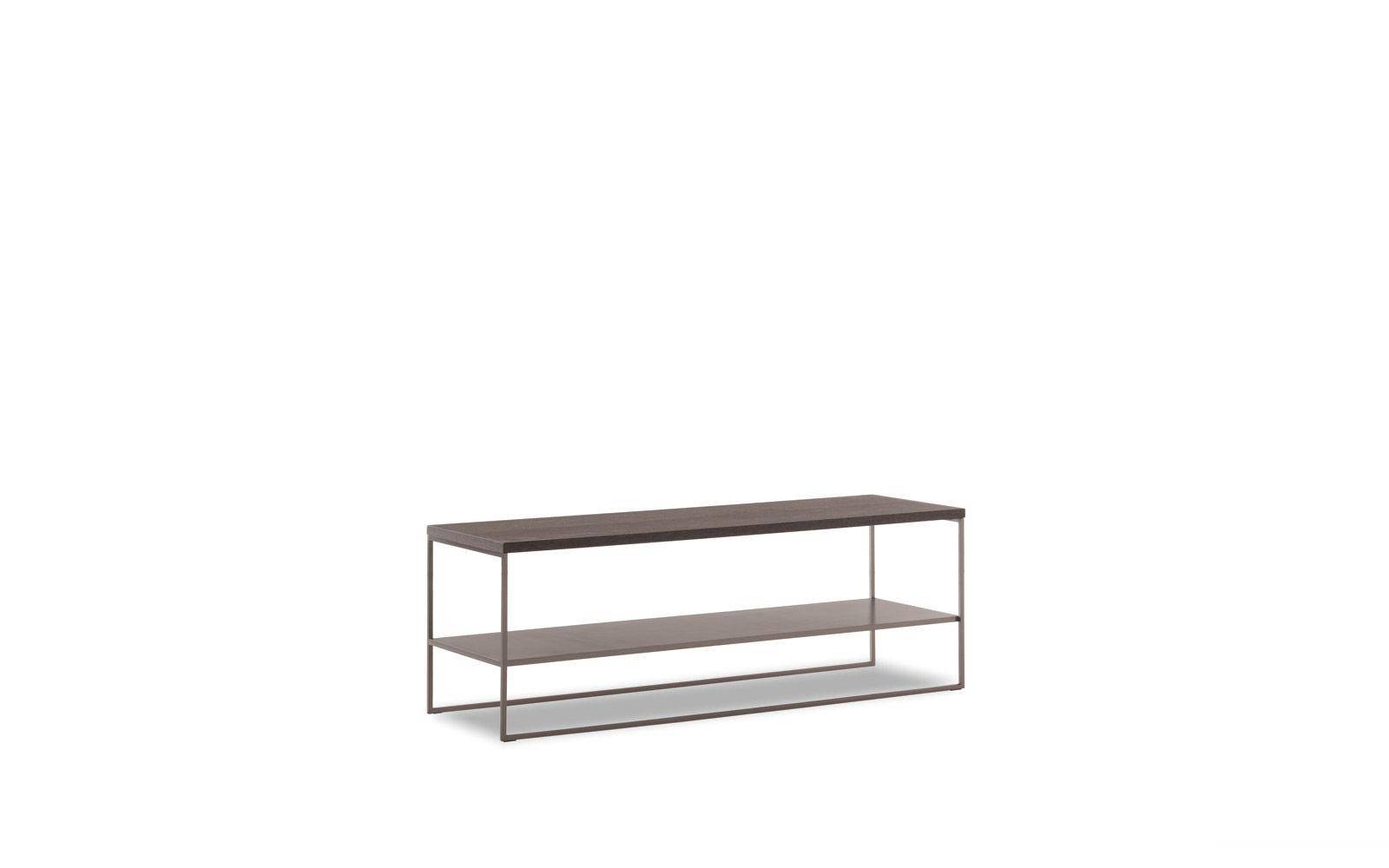 A series of new finishes contributes a fresh, contemporary appeal to the Calder family that comprises many coffee tables and console tables, available in several sizes. The slender iron structure now comes in a Bronze satin finish. Several new versions of the top are also available: glossy lacquered Sand, Sucupira veneer stained Mink color, and Bardiglio Nuvolato or Calacatta marble. The under shelf is also in satin finish metal painted Bronze.