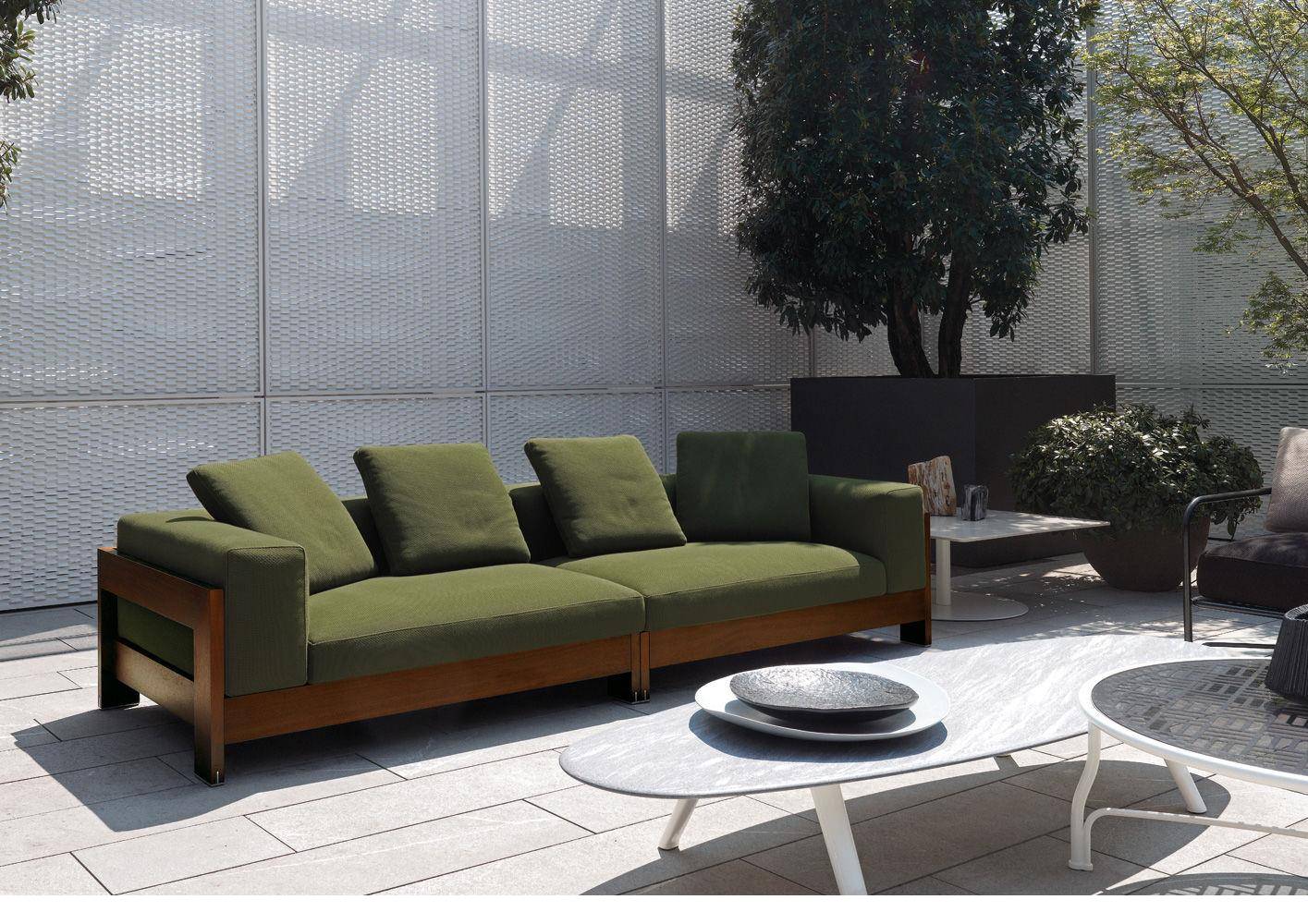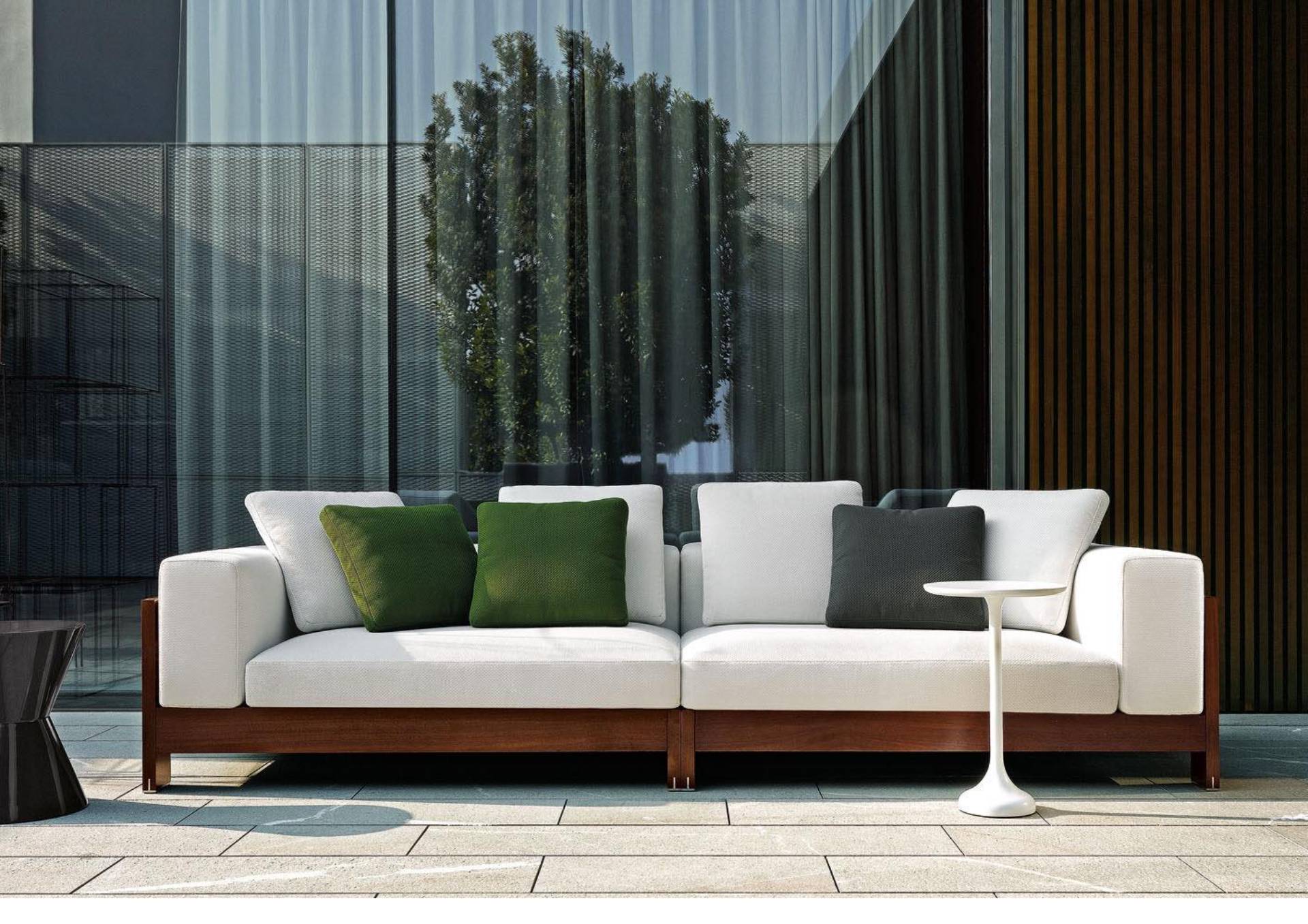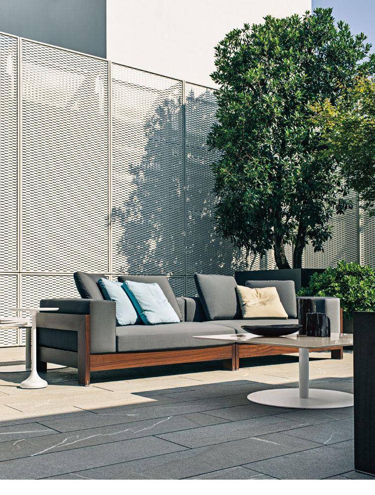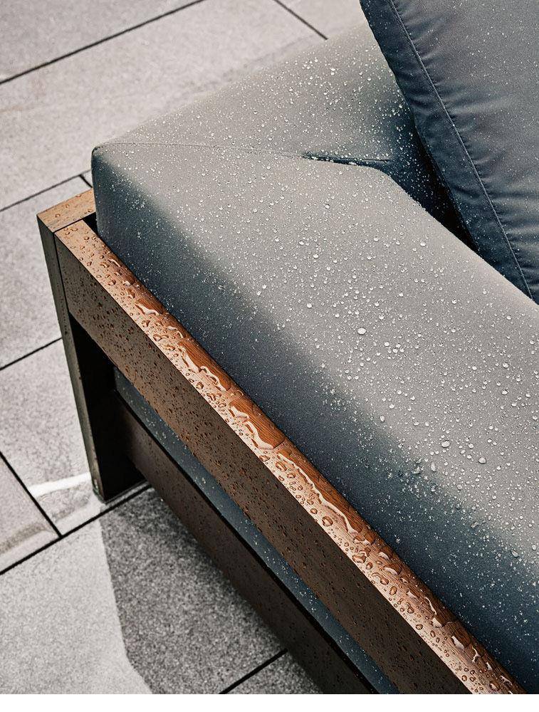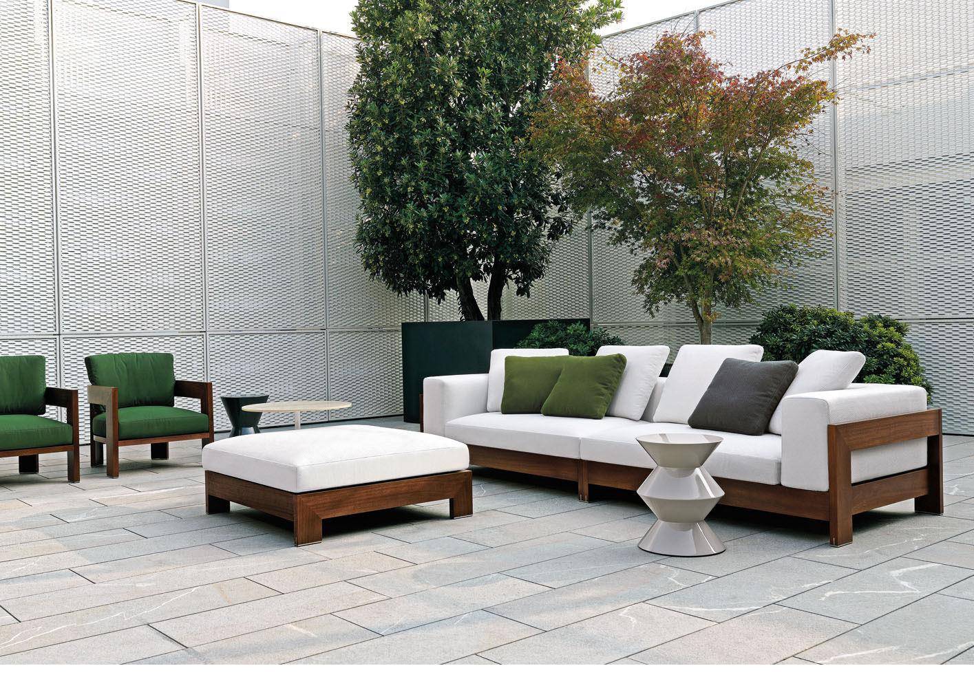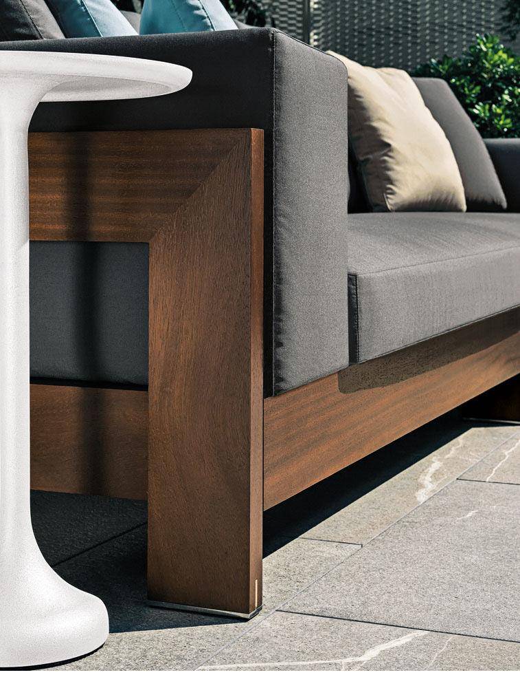 A seating system designed in 2006, and now in its iroko version, in a way foreshadowed the concept of the Lifescape Collection. In other words, a range of furnishings whose use was specifically designed for both indoor and outdoor use. The sleek design of Alison Iroko Outdoor, with its simple squared-off lines, finds its ultimate expression in the choice of iroko heartwood for its exposed frame. Its warm color and smooth touch, thanks to the natural finish, lend the frame a bold look and play up the architectural details, like the 45° angle joint on the arms. The clean lines of the frame are matched by the seat, back and armrest cushions that share the same square shape, but are generously padded. A new, exclusive collection of exterior fabrics, available in sophisticated colors and textures, lends a crisp, lively note to the Alison Iroko Outdoor sofas. Iroko wood furniture frames rest on stainless steel tips set into slots in the wood. This technique eliminates direct contact between the wood and the outdoor surface as a safeguard against damage due to humidity.