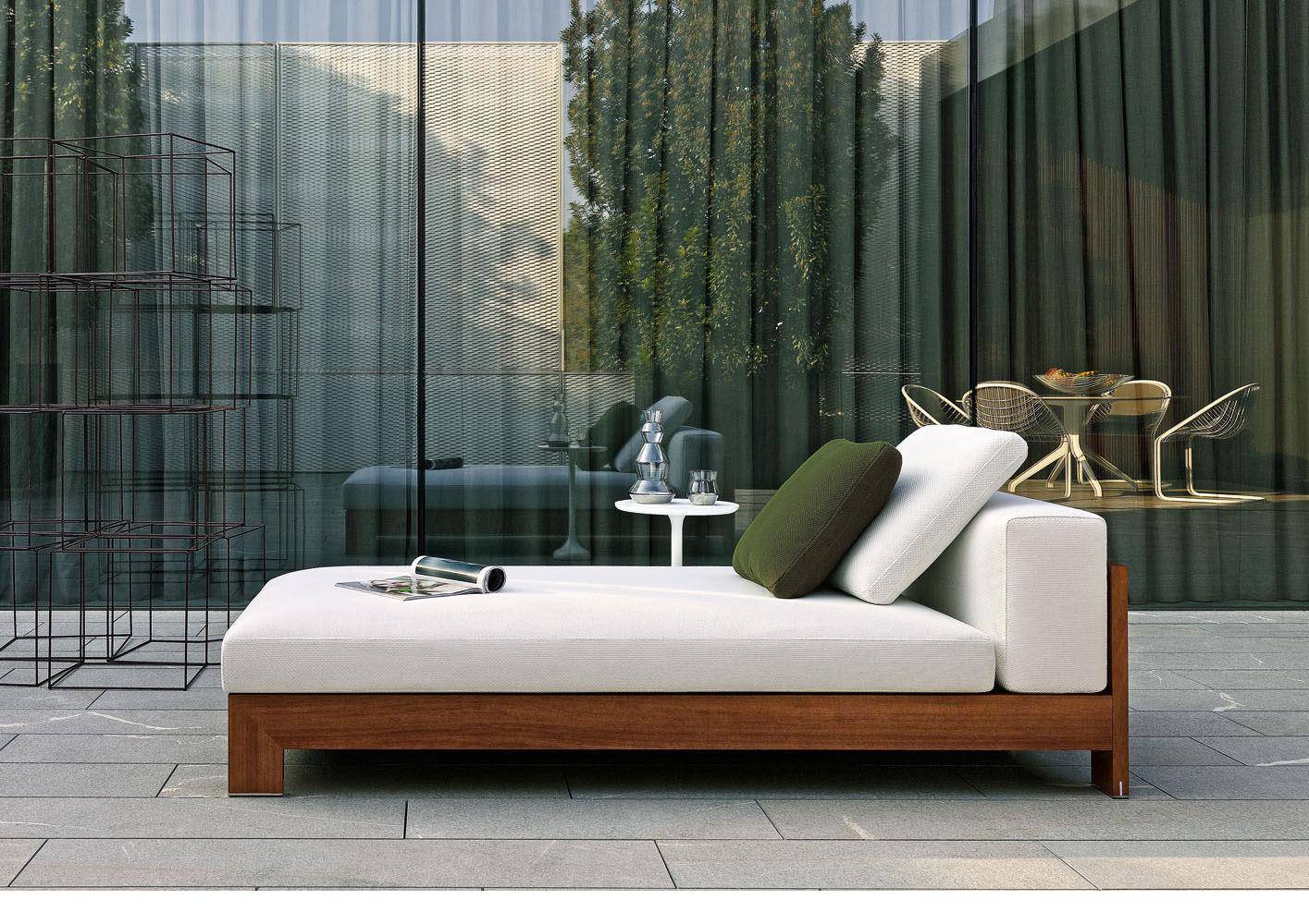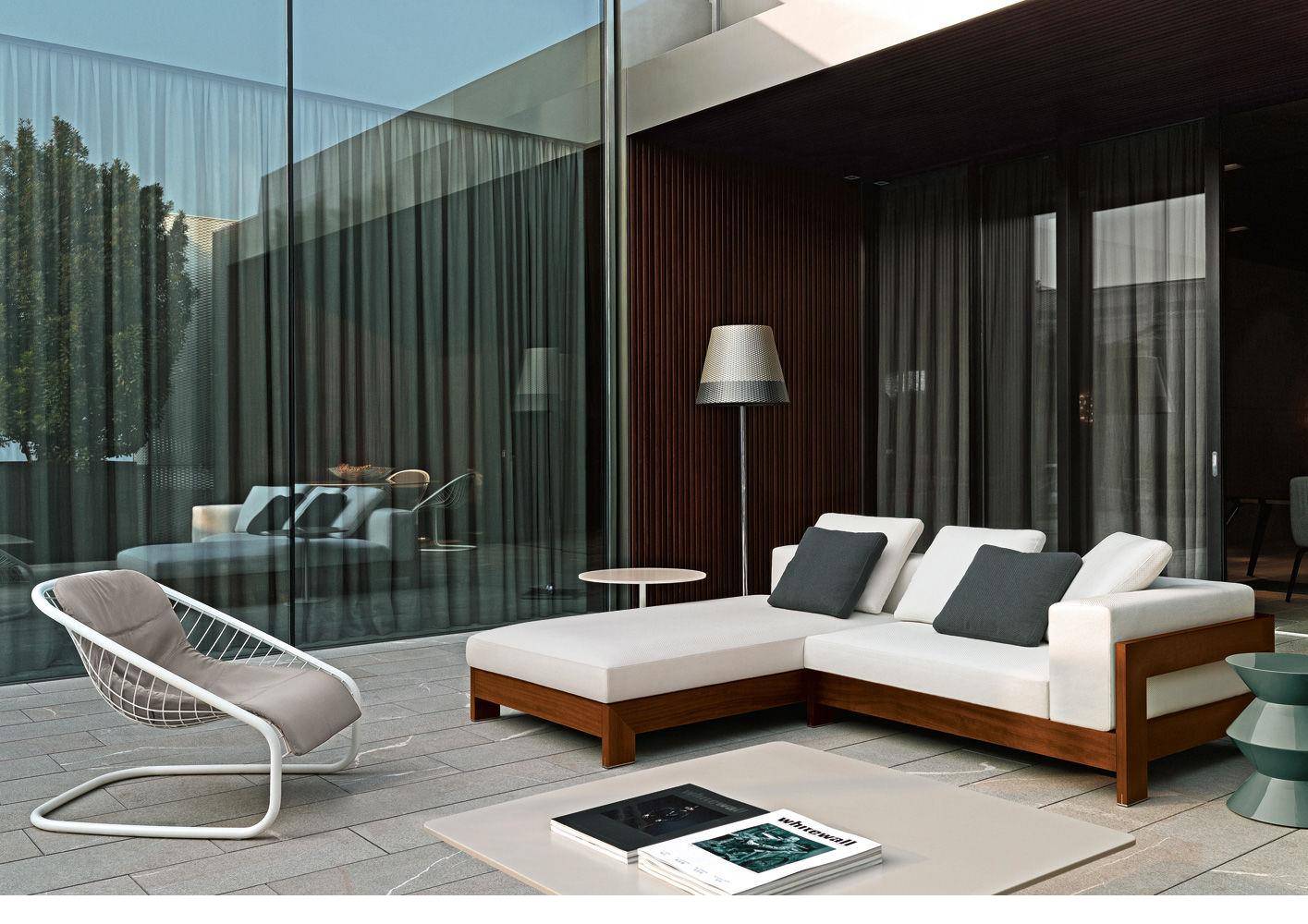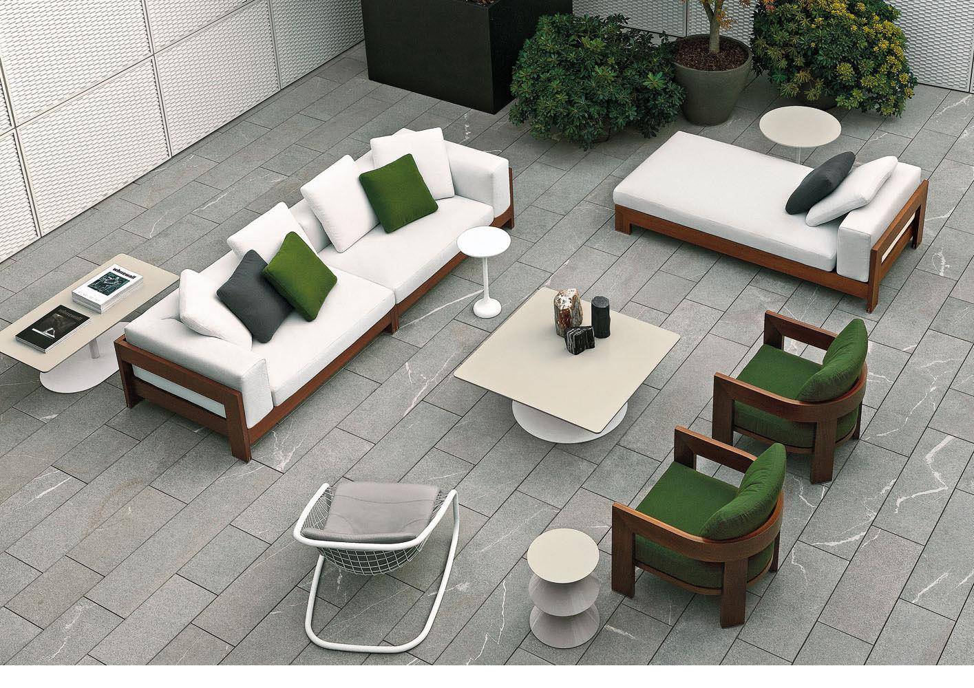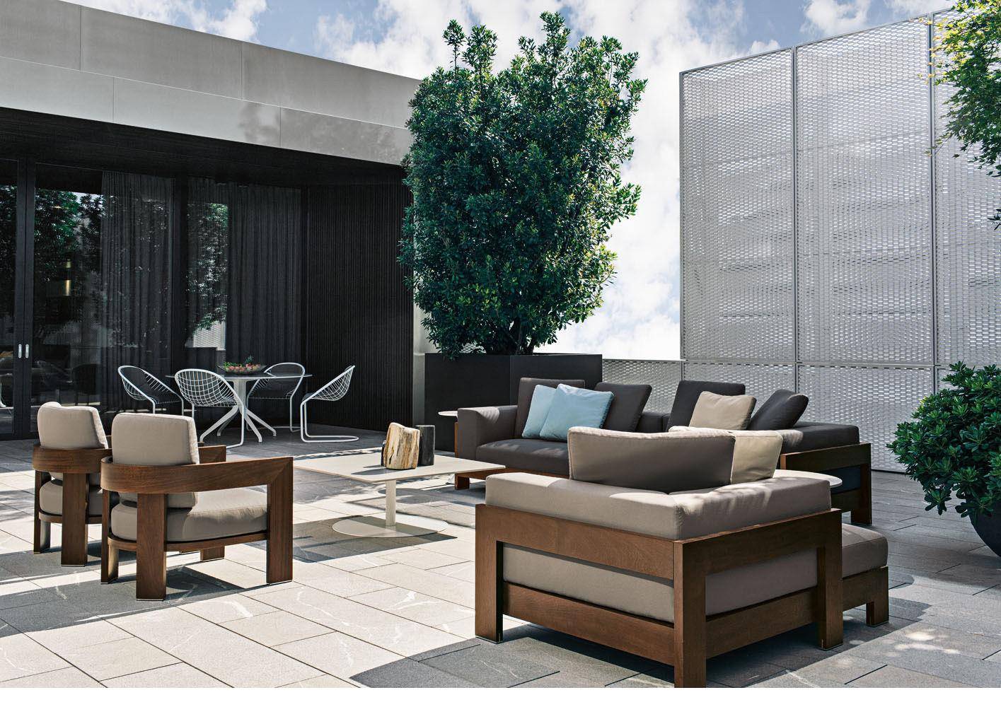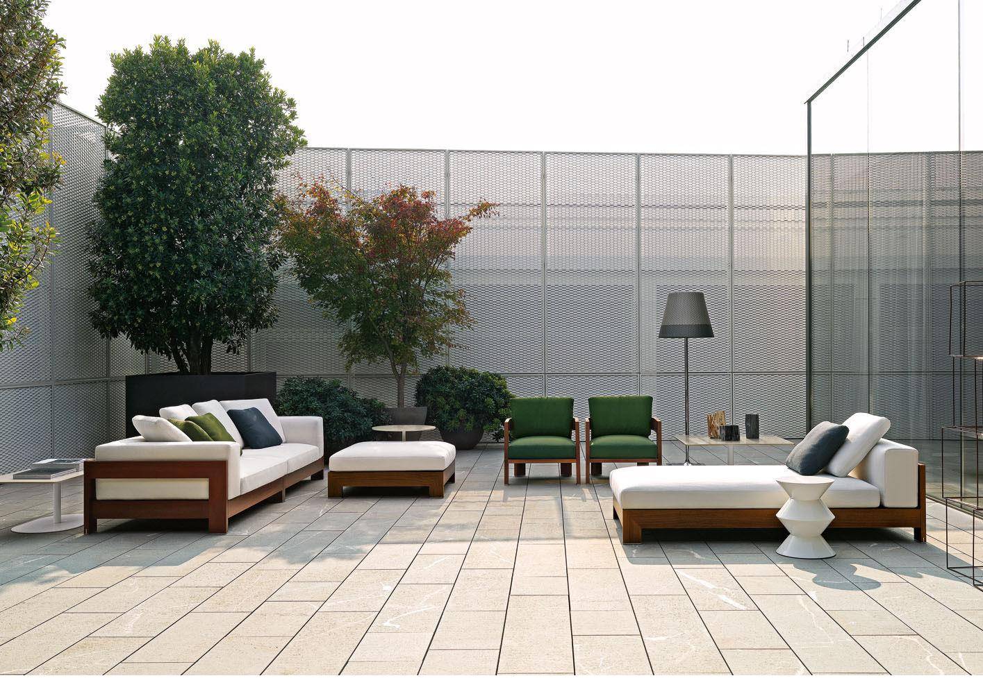 A seating system designed in 2006, and now in its iroko version, in a way foreshadowed the concept of the Lifescape Collection. In other words, a range of furnishings whose use was specifically designed for both indoor and outdoor use. The sleek design of Alison Iroko Outdoor, with its simple squared-off lines, finds its ultimate expression in the choice of iroko heartwood for its exposed frame. Its warm color and smooth touch, thanks to the natural finish, lend the frame a bold look and play up the architectural details, like the 45° angle joint on the arms. The clean lines of the frame are matched by the seat, back and armrest cushions that share the same square shape, but are generously padded. A new, exclusive collection of exterior fabrics, available in sophisticated colors and textures, lends a crisp, lively note to the Alison Iroko Outdoor sofas. Iroko wood furniture frames rest on stainless steel tips set into slots in the wood. This technique eliminates direct contact between the wood and the outdoor surface as a safeguard against damage due to humidity.