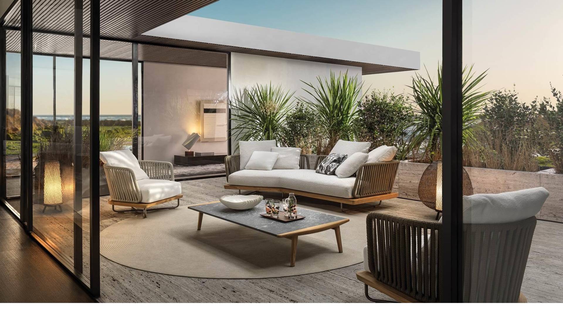 With its enveloping design, the Sunray seating system is inspired by the desire to design situations that convey a sensation of intimacy and relaxation, in line with the concept of open-air living that imitates the comfort and beauty of indoor furnishing solutions.