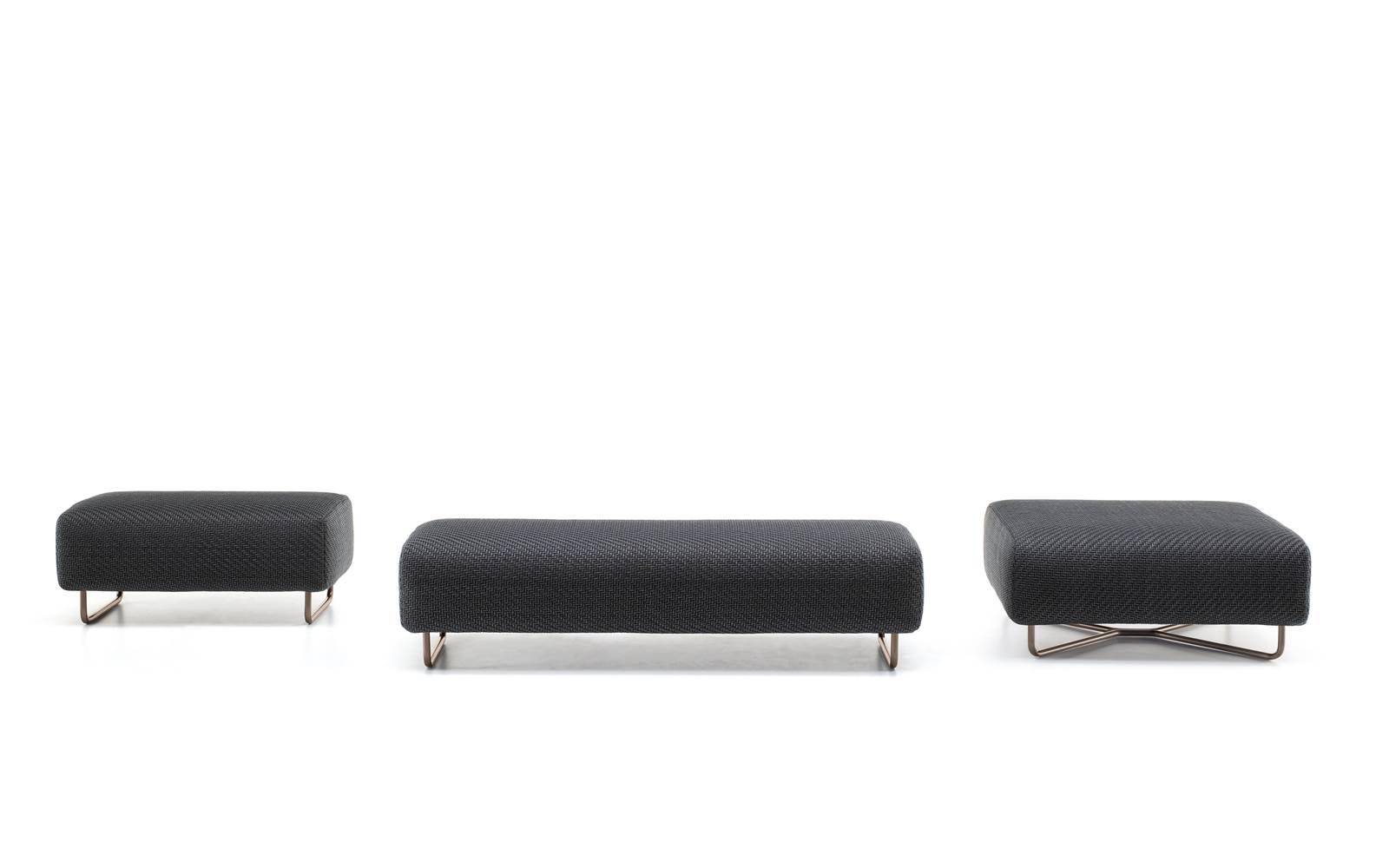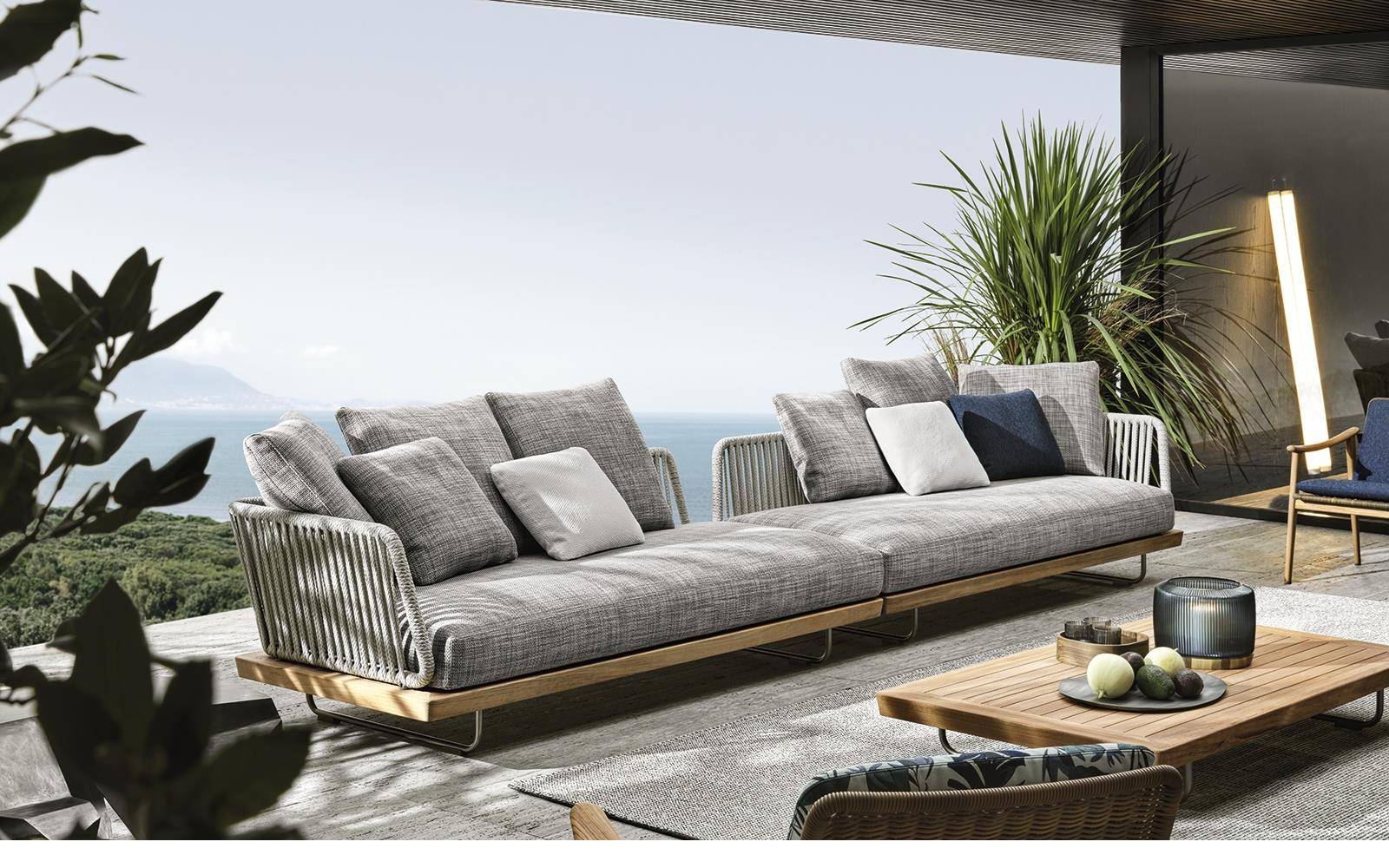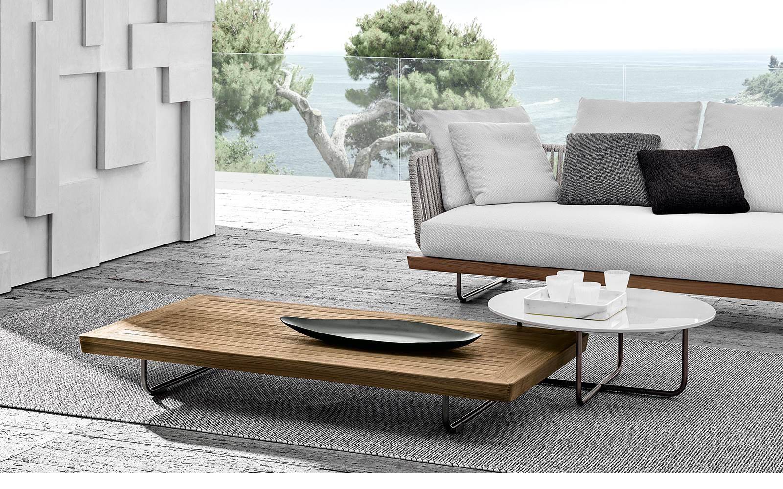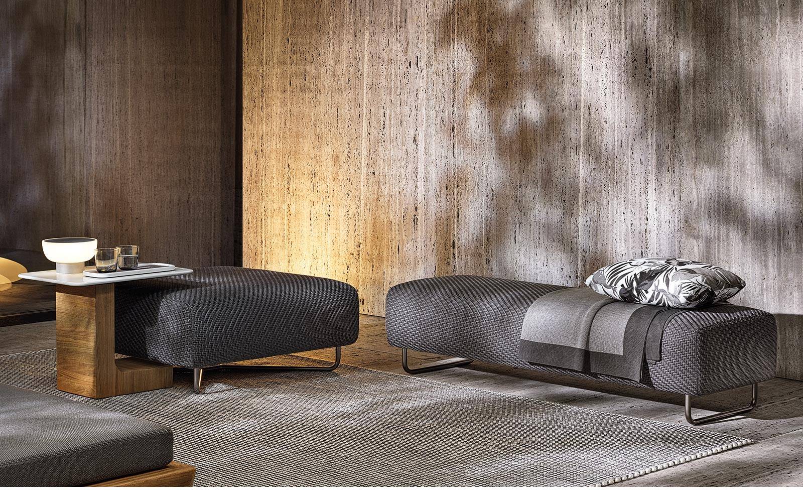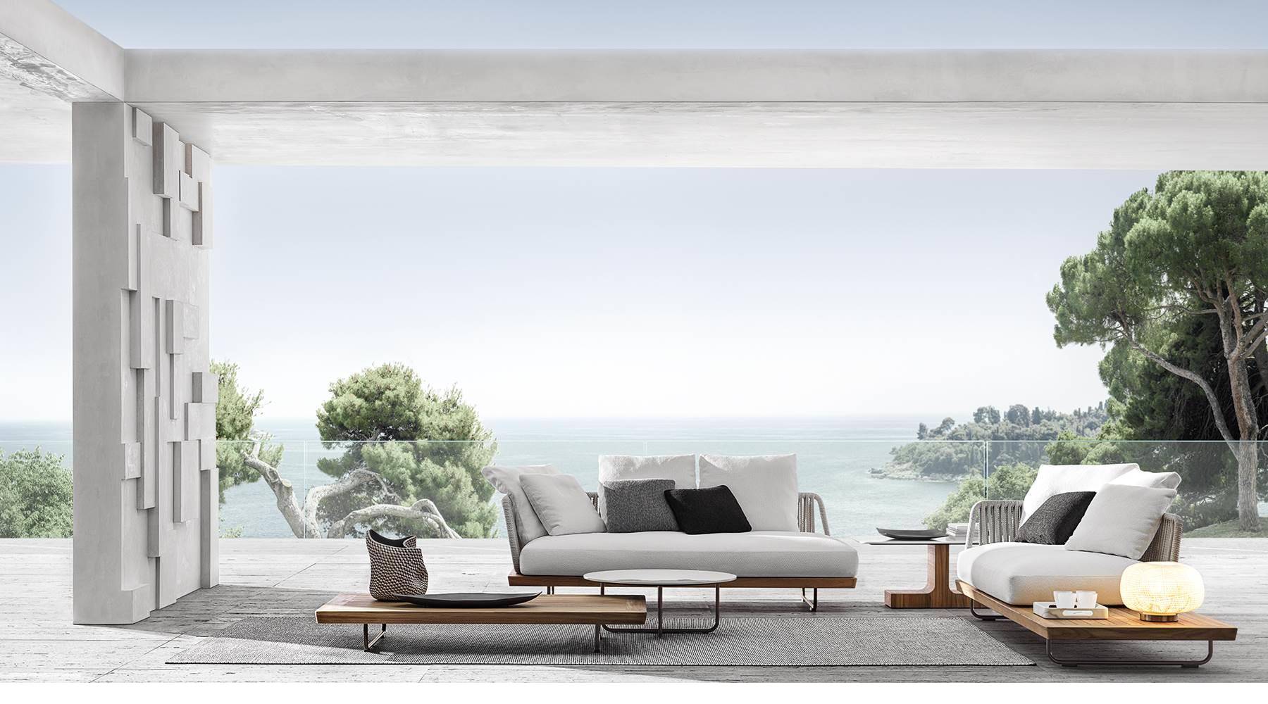 The system, composed of pieces that can be used alone or combined together, offers a variety of compositional solutions thanks to the high versatility of its elements. The family is composed of armchair, sofa, end element with or without extending top, chaise-longue, loveseat, daybed with reclining backrest, and square and rectangular coffee tables.