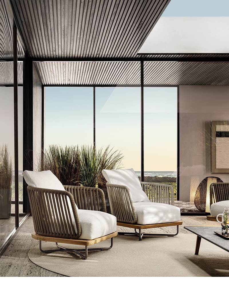 It juxtaposes different shapes and materials: its airy surface in natural teak wood defines its horizontal line, while the curved backrest with interwoven cords gives it a dynamic allure.