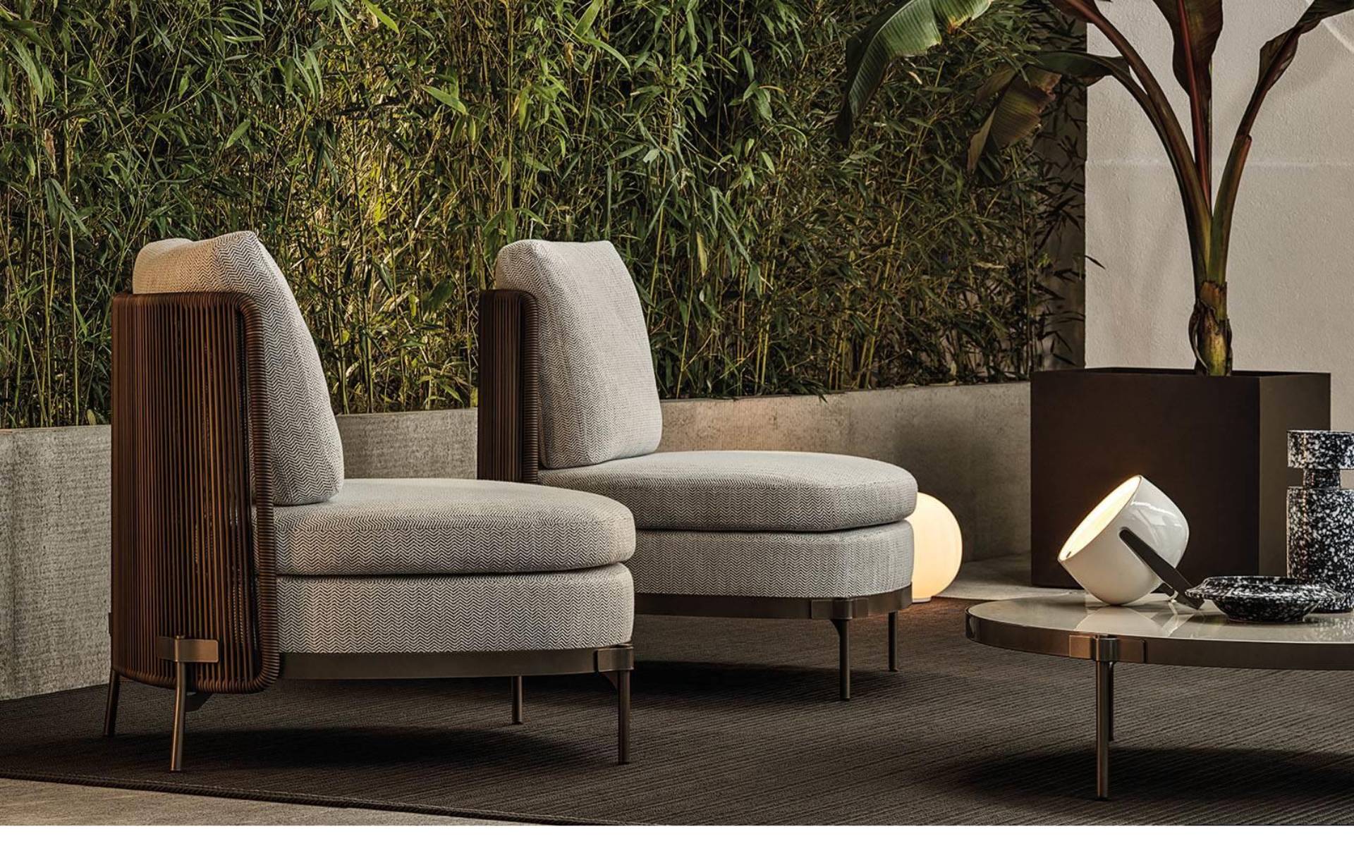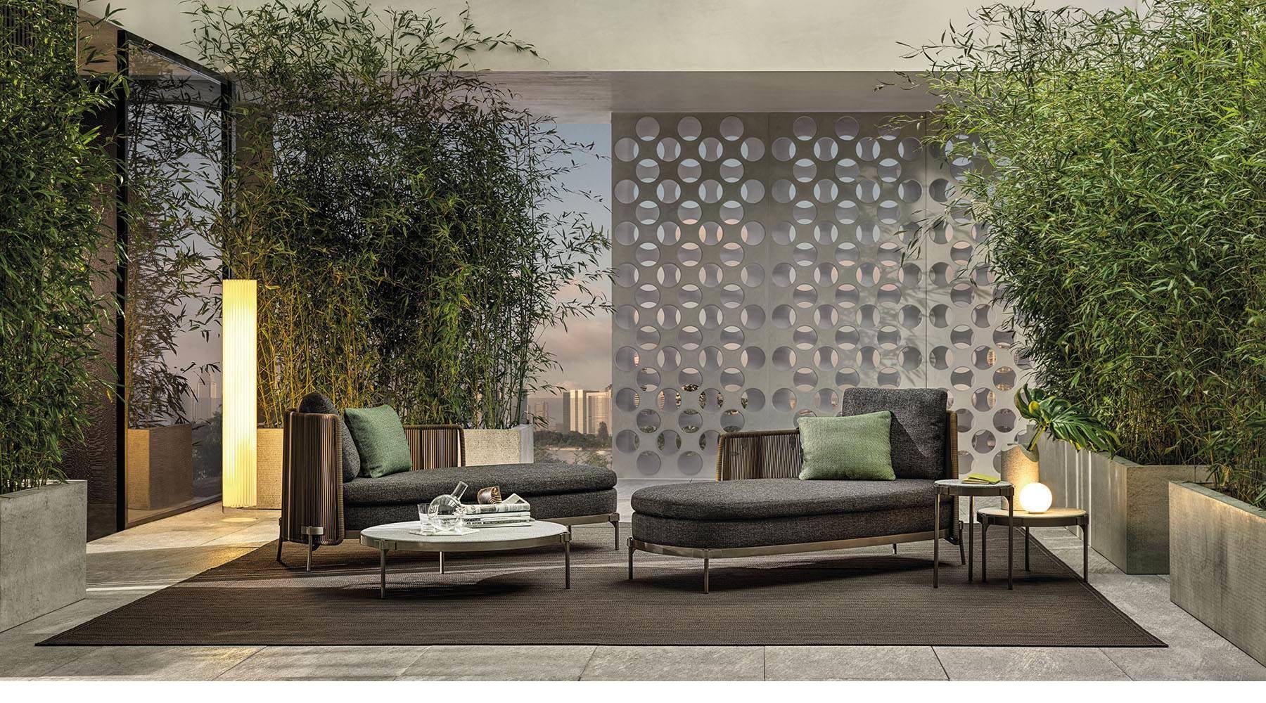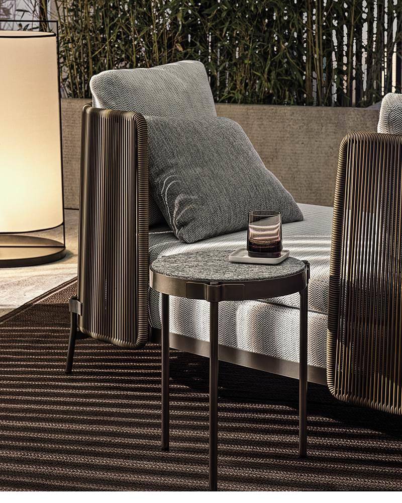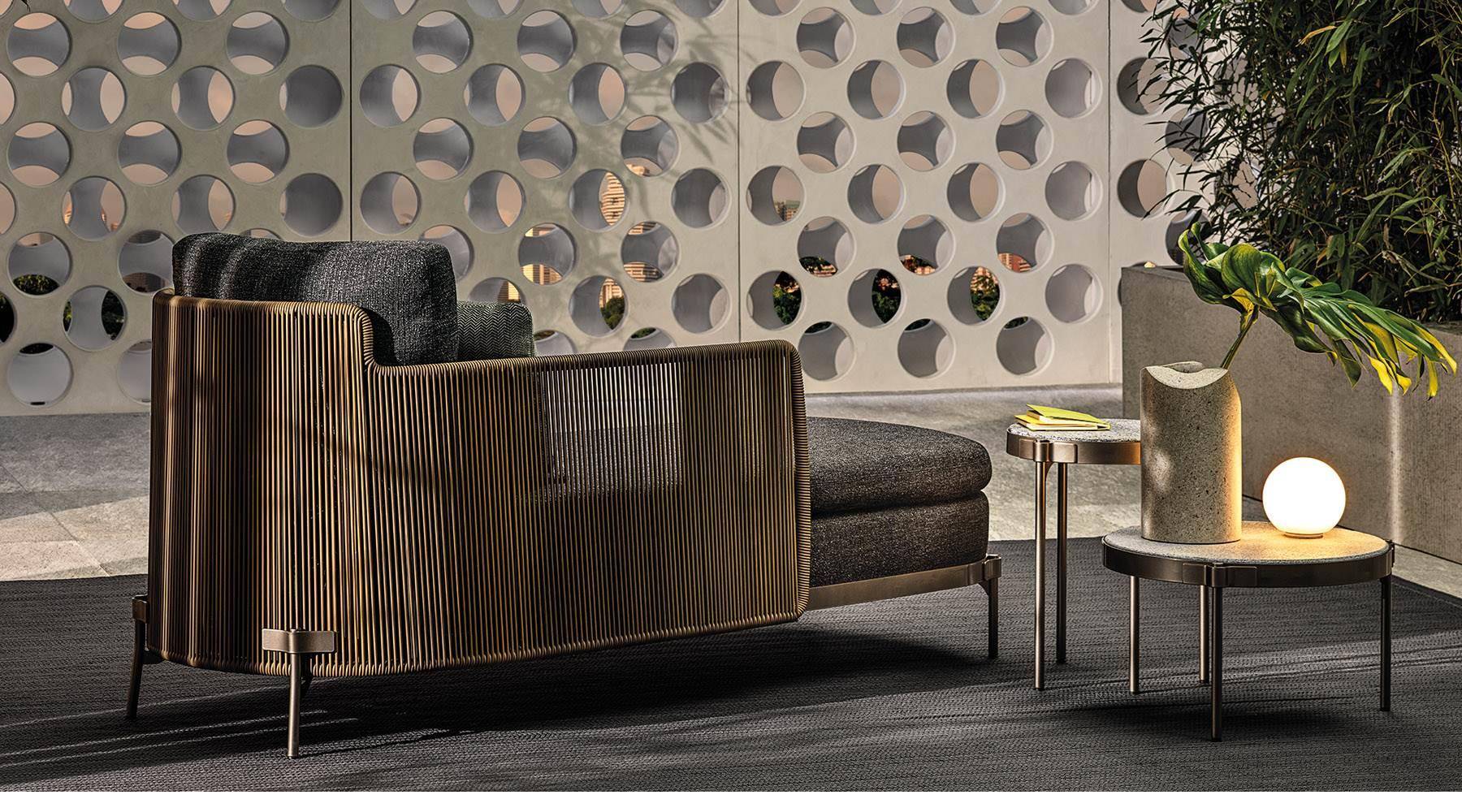The system offers many elements, ideal for creating relaxation areas also in small outdoor spaces or on urban rooftop terraces: from the armchair to the sofa, from the Paolina chaise longue to the original couch open at the back, from the chair to the coffee tables, up until the stool in two heights of 102 and 115 cm, in the collection from January 2020.
