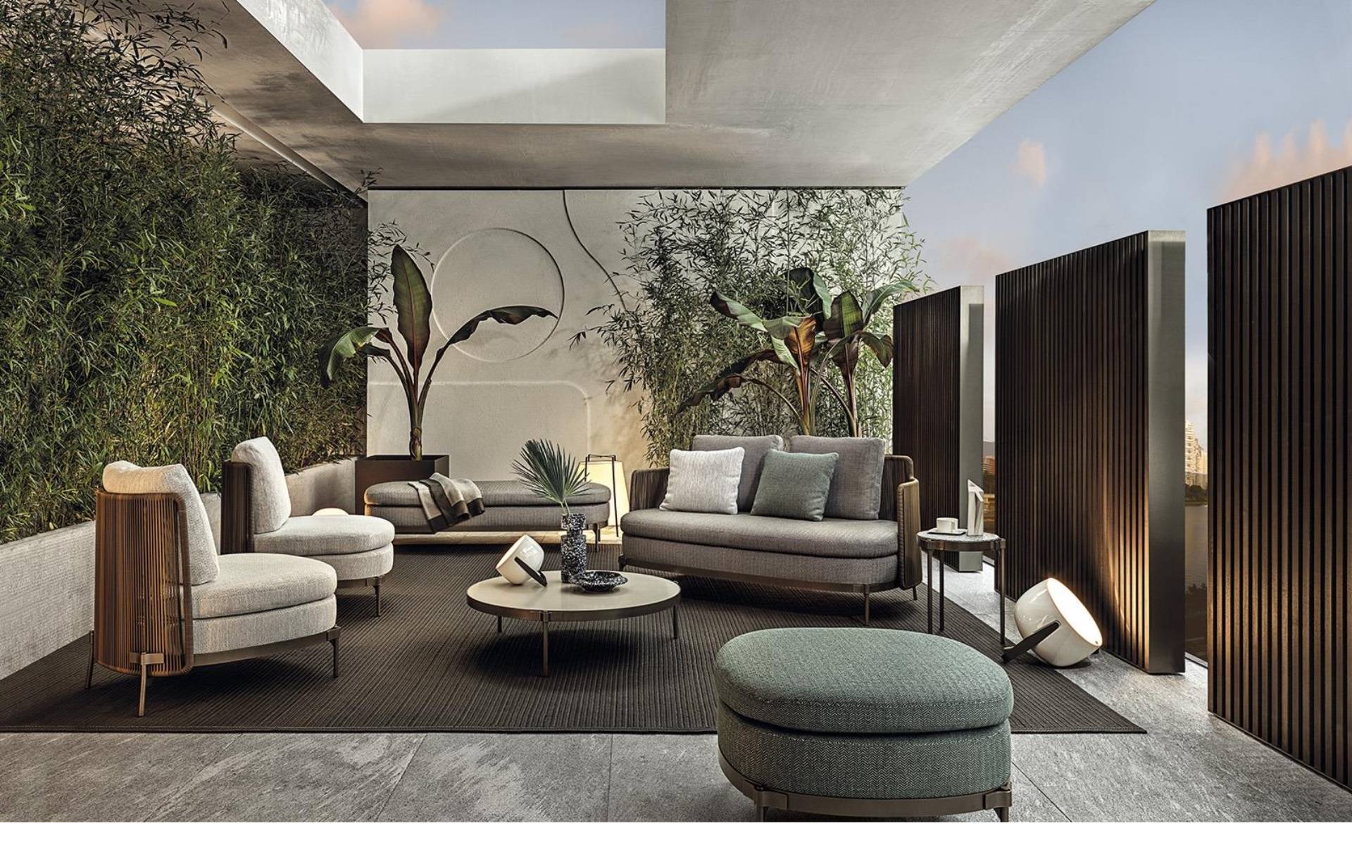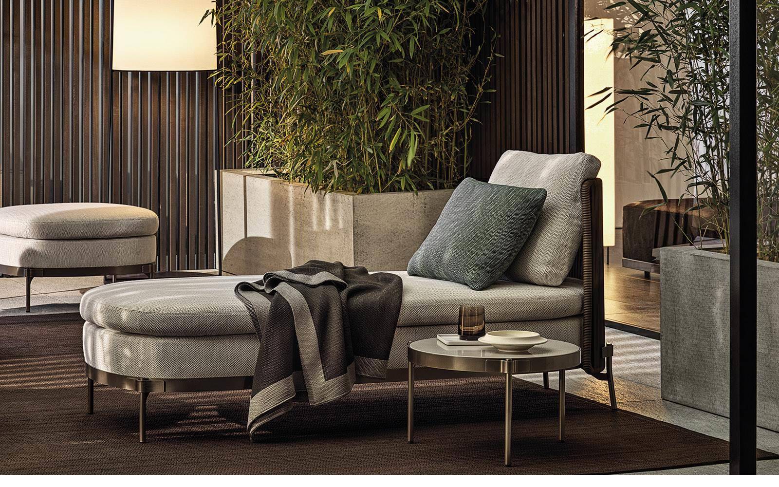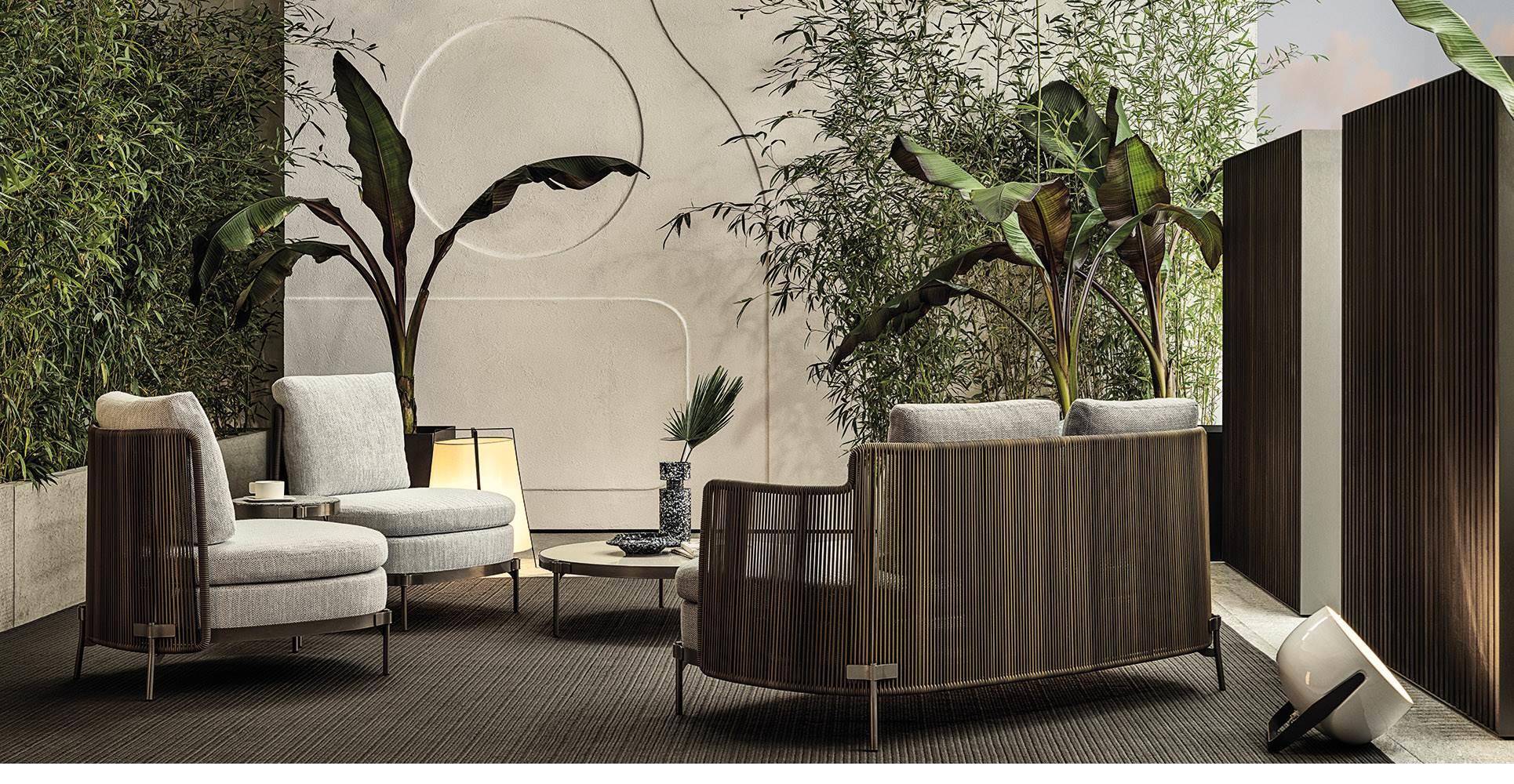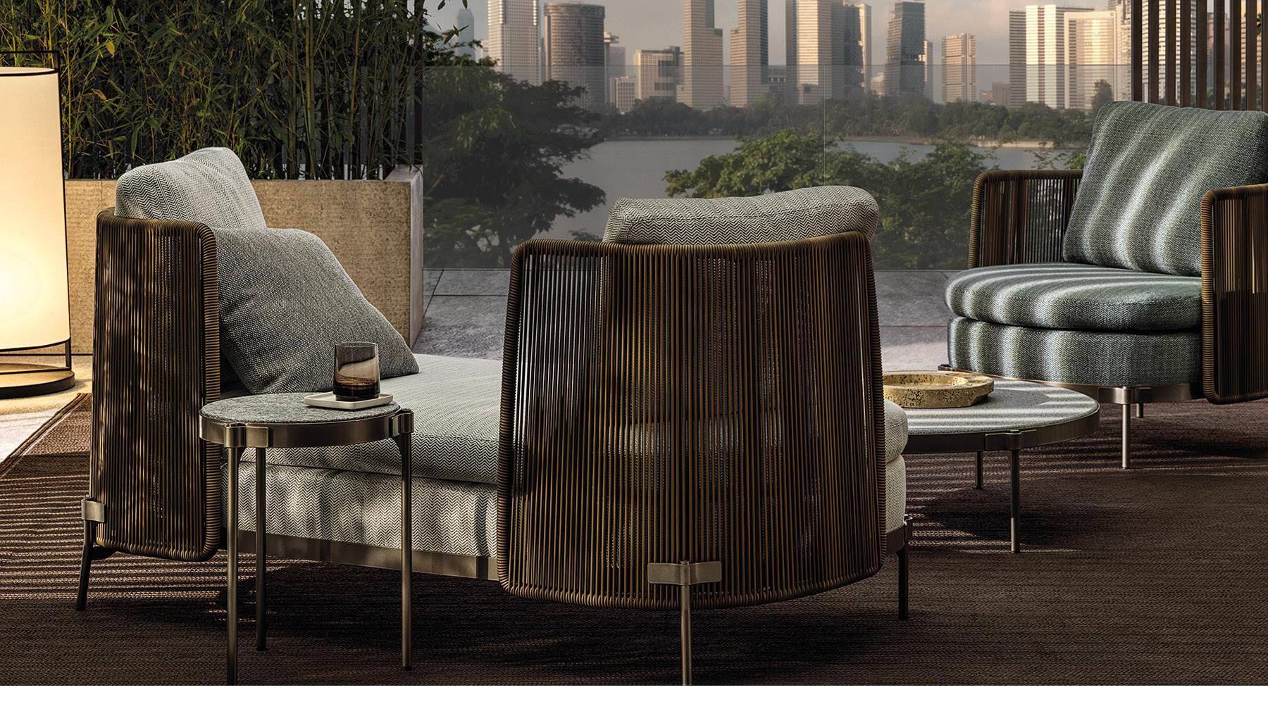 The system offers many elements, ideal for creating relaxation areas also in small outdoor spaces or on urban rooftop terraces: from the armchair to the sofa, from the Paolina chaise longue to the original couch open at the back, from the chair to the coffee tables, up until the stool in two heights of 102 and 115 cm, in the collection from January 2020.