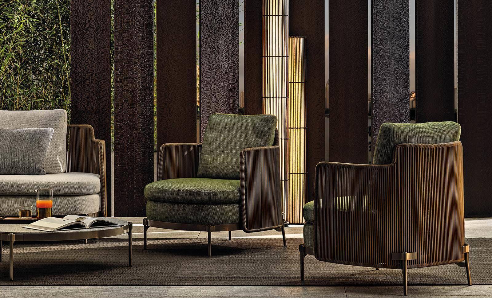 The seats become deeper, larger and more relaxing, while the metal frame, in a new outdoor finish, is covered with the wicker-effect cords available in two colours: Mud and Liquorice.