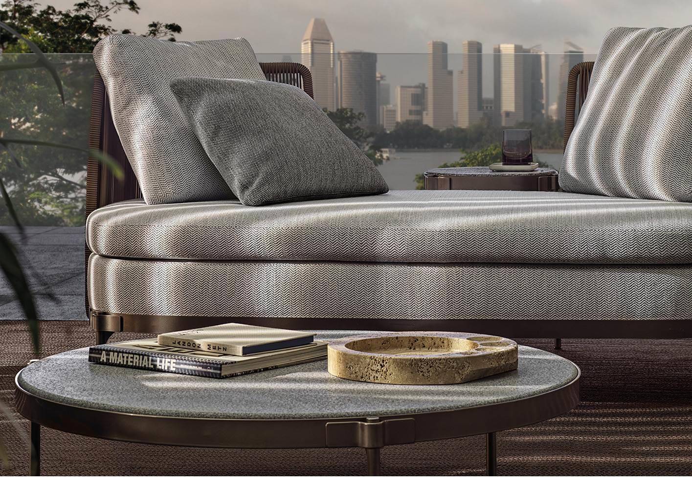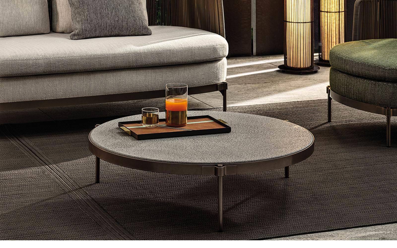 The concept of the small tables in metal with Bronze finish is inspired by the distinctive Tape detail itself, which aesthetically secures the legs to the crown, inside which the top in Silver Beola or Corian® EC is inserted.