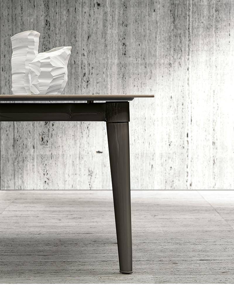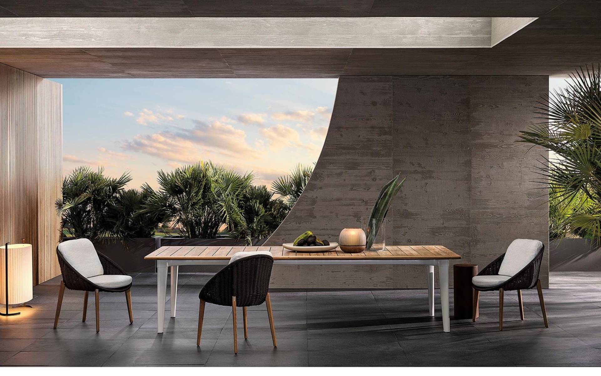 A table that expresses all the force of an architectural element, available in four sizes, three rectangular and one round, making it suitable for use in different spaces, from city verandas to larger garden settings.