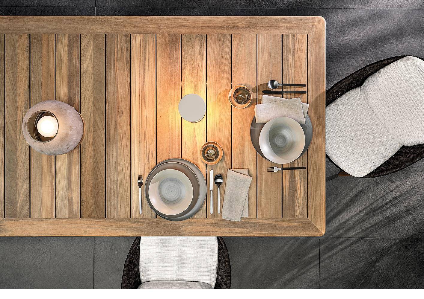 The 2021 version of Terrace presents the rectangular top in solid teak with a natural finish, and frame and legs varnished in White.