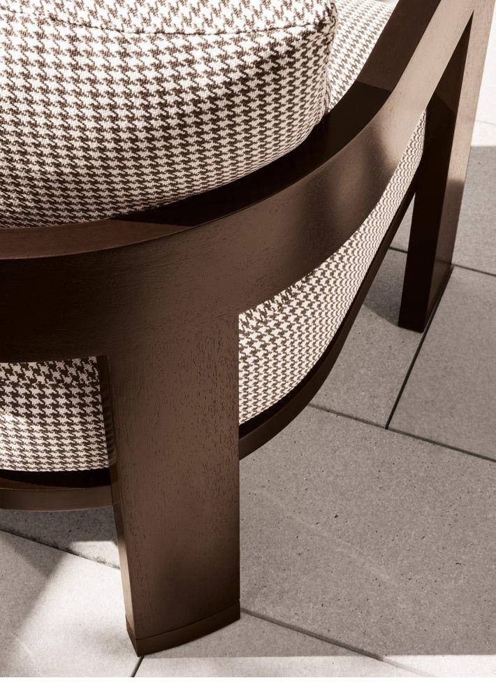 The new dark brown iroko finish and covering in Mali pied-de-poule textile emphasize the elegance of the Warhol “Dark Brown” Outdoor armchair, distinguished by its compact footprint and sleek design.