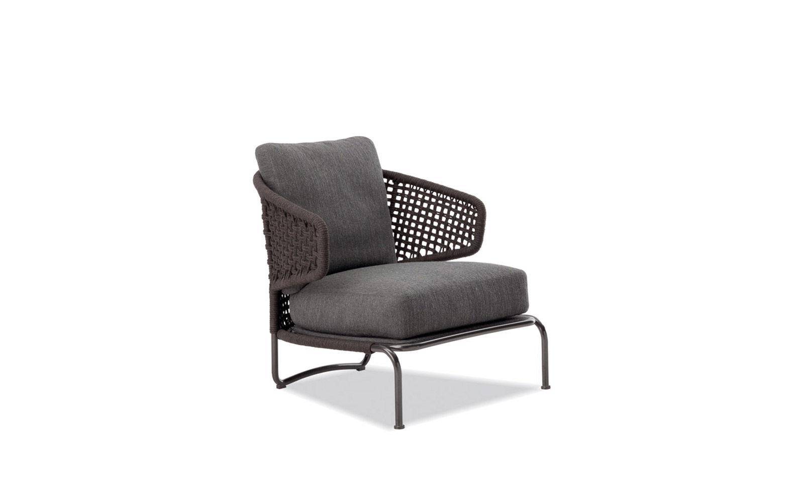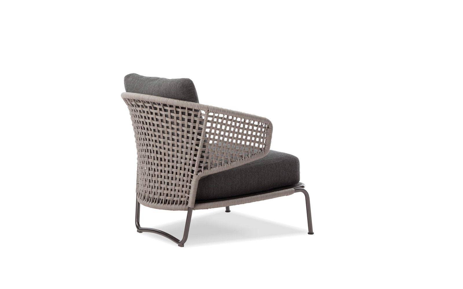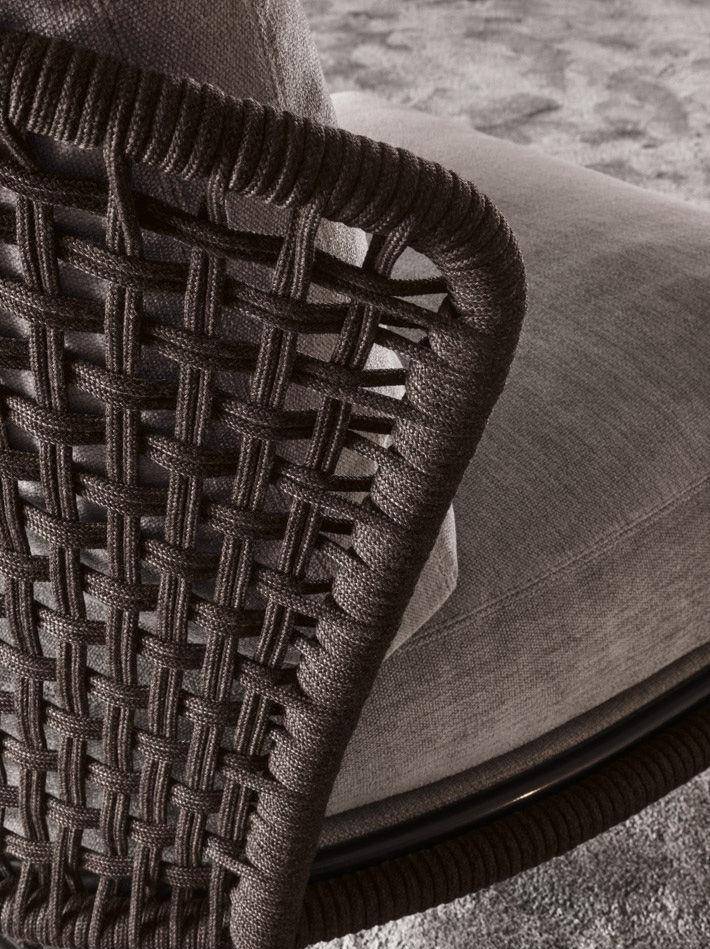 The Aston “Cord” Indoor armchair offers a different take on the same theme through the use of different materials. The painted metal frame is finished in Pewter color and the seat back is in a special braided 7 mm diameter polypropylene cord, available in two color variations: light grey and dark brown. The Aston “Cord” Indoor armchair is available with and without arms, ready to lend its fresh, informal personality to the creation of interior design projects where the interaction moves freely between indoors and outdoors.