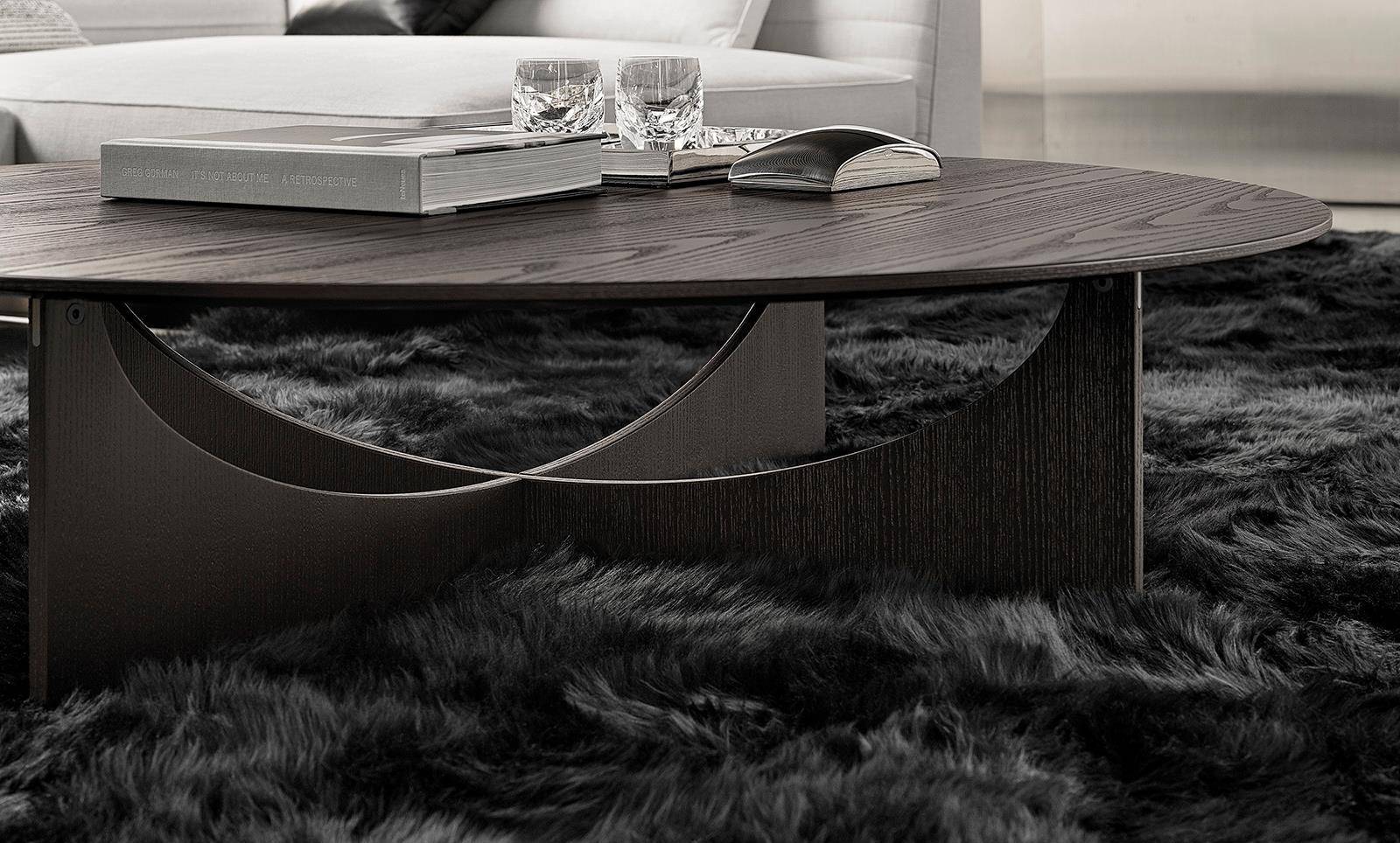 The family also includes little dining and lounge armchairs - only with legs in solid wood - and coffee tables in one size that sit on the iconic X-shaped aluminium base covered in ash with a Moka varnished finish, with round or square top, in Bianconero marble or brushed ash wood with a Moka open-pore lacquered finish.