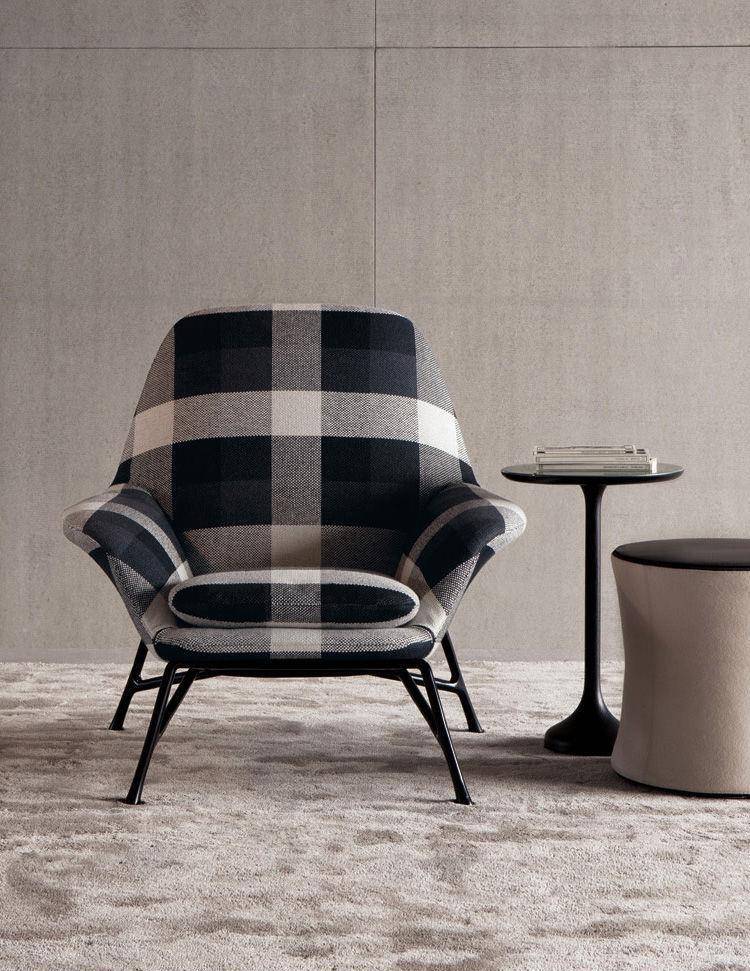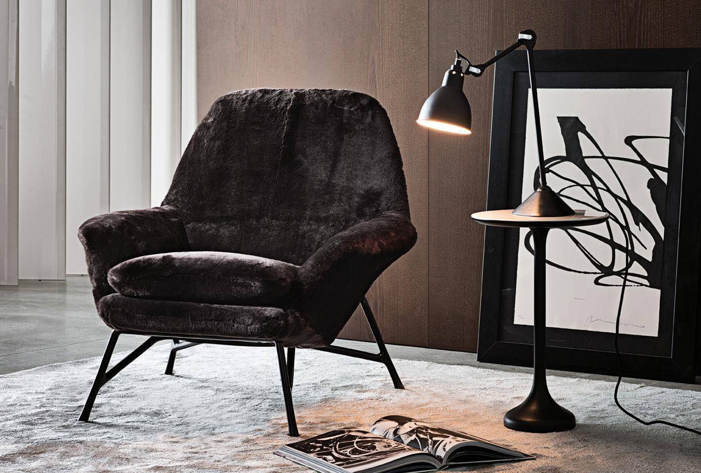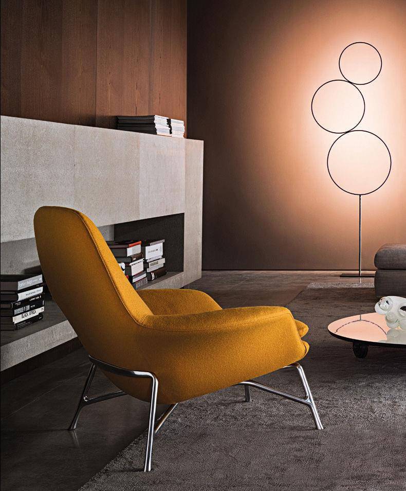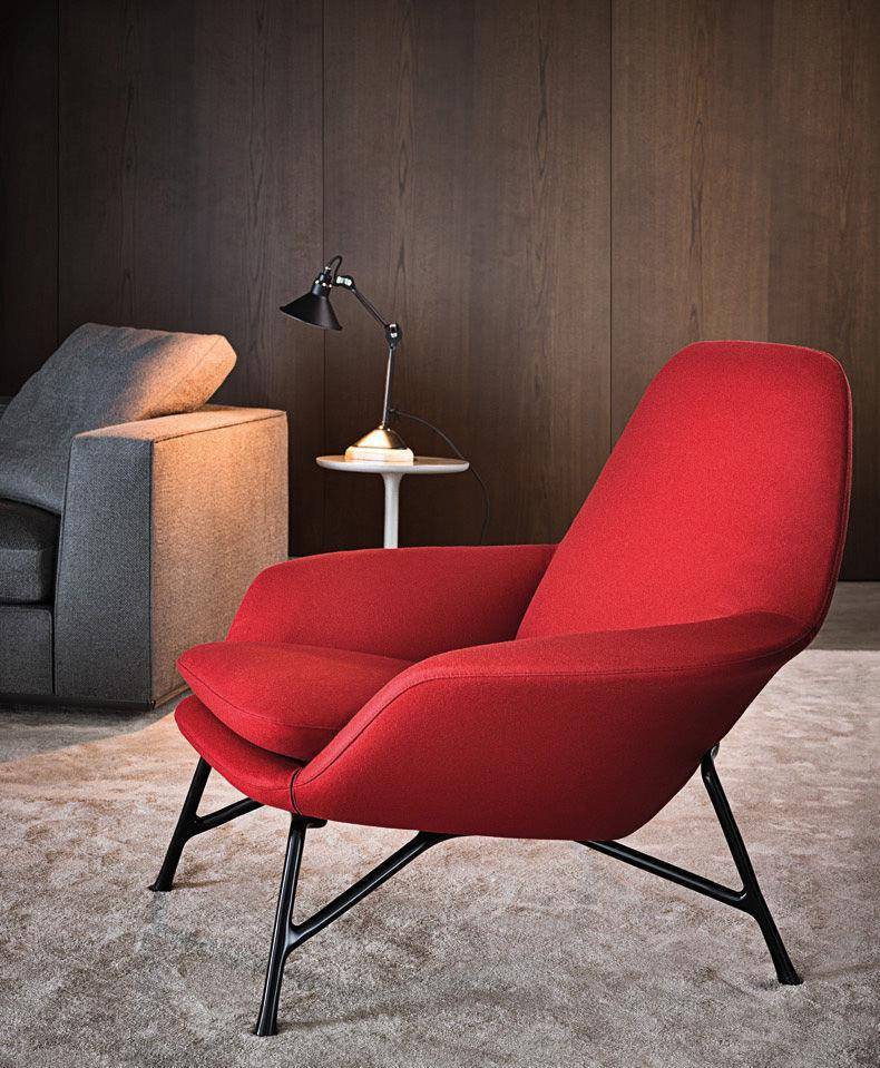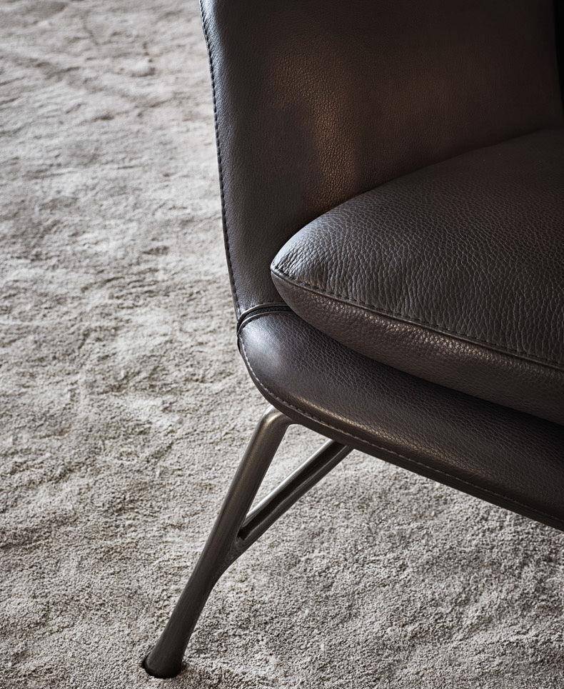 An armchair featuring the latest technology and the most innovative materials in shapes that are reminiscent of the classic design tradition of the 50’s. A particularly complex design process gives rise to a die-cast aluminum base, a shape with changing lines and thicknesses producing an industrial design element whose aesthetics are similar to a sculpture.