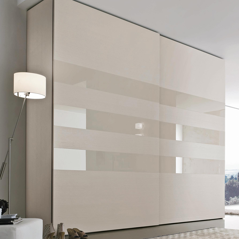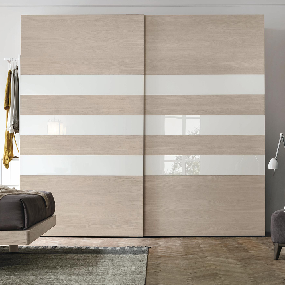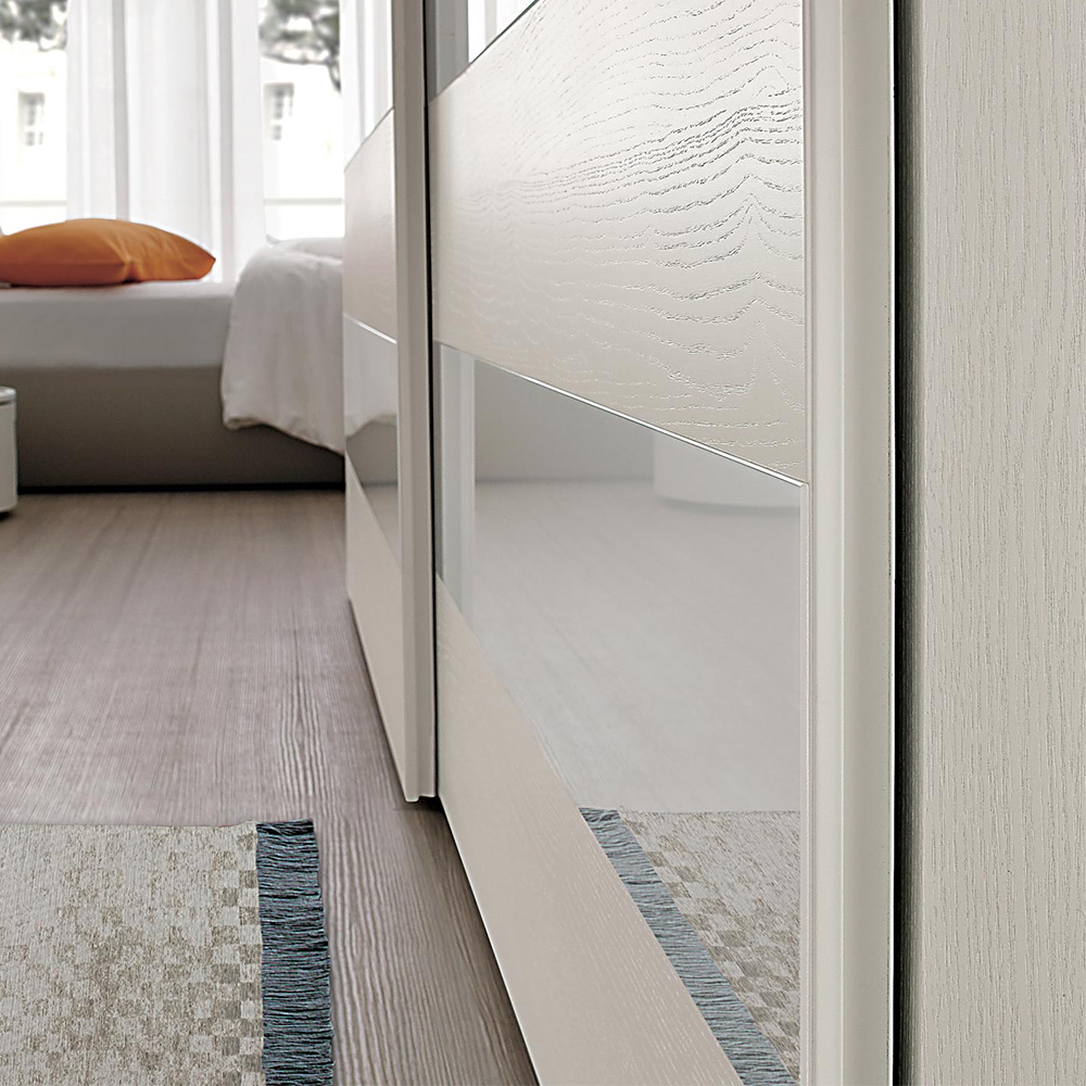 The Step 3 door features great versatility, allowing you to create contrasts in colours and materials, making the wardrobe the true protagonist. A single surface is only broken by a horizontal glass panel and a vertical groove that hosts a grip-recess handle in the thick edge of the door: a practical and convenient gap that makes opening and closing movements easier.