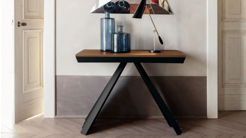 Ventaglio is an extendible console table, that can become a quite large dining table. The lacquered metal base is perfect for the wood covered tops.