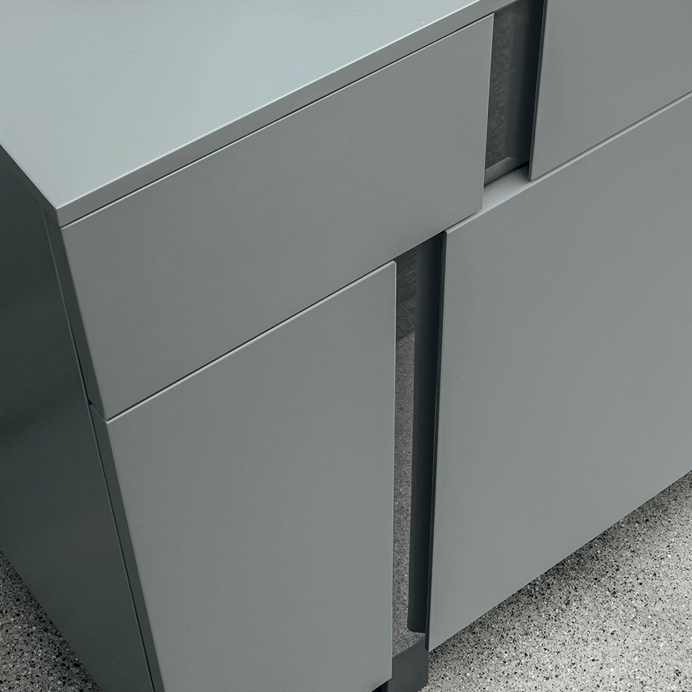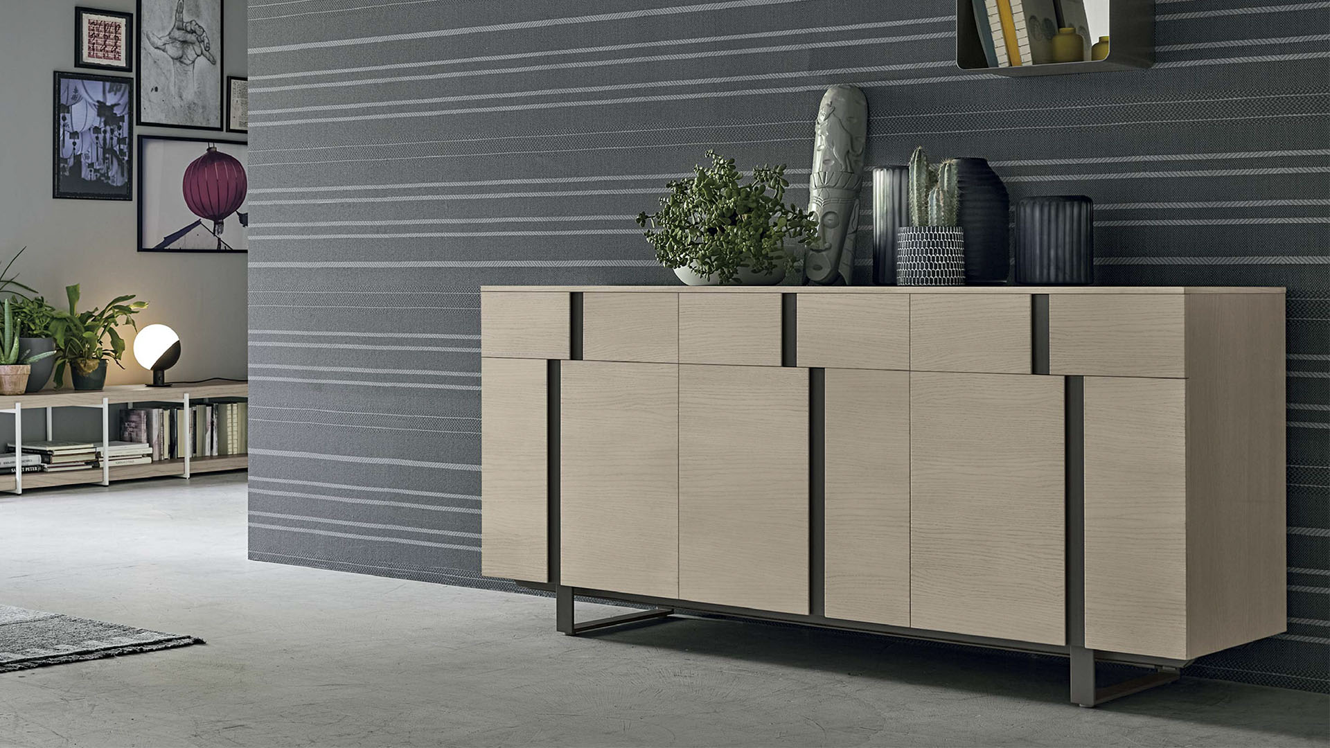 3-door Athena sideboard with a textured eastern ash carcass, matt anthracite 160 lacquered inserts and anthracite 160 metal base.