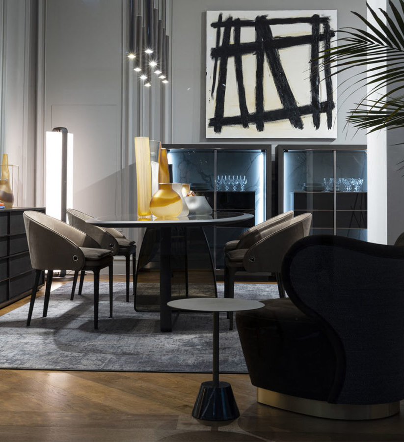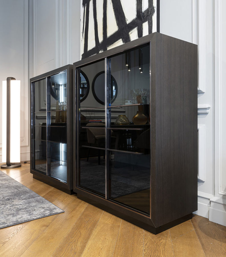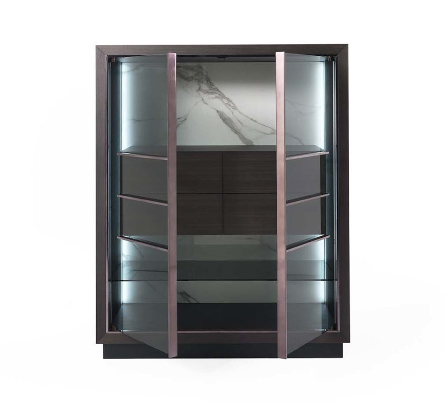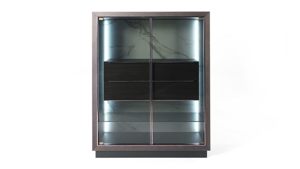 The cabinet completes the New Orleans line by combining aesthetics and functionality. Characterized by a gres porcelain back with Calacatta design, paired with a smoked glass, it is equipped with a technology that allows the LED inserted in the showcase to be switched on simply by approaching the base, allowing an intimate and refined lighting.