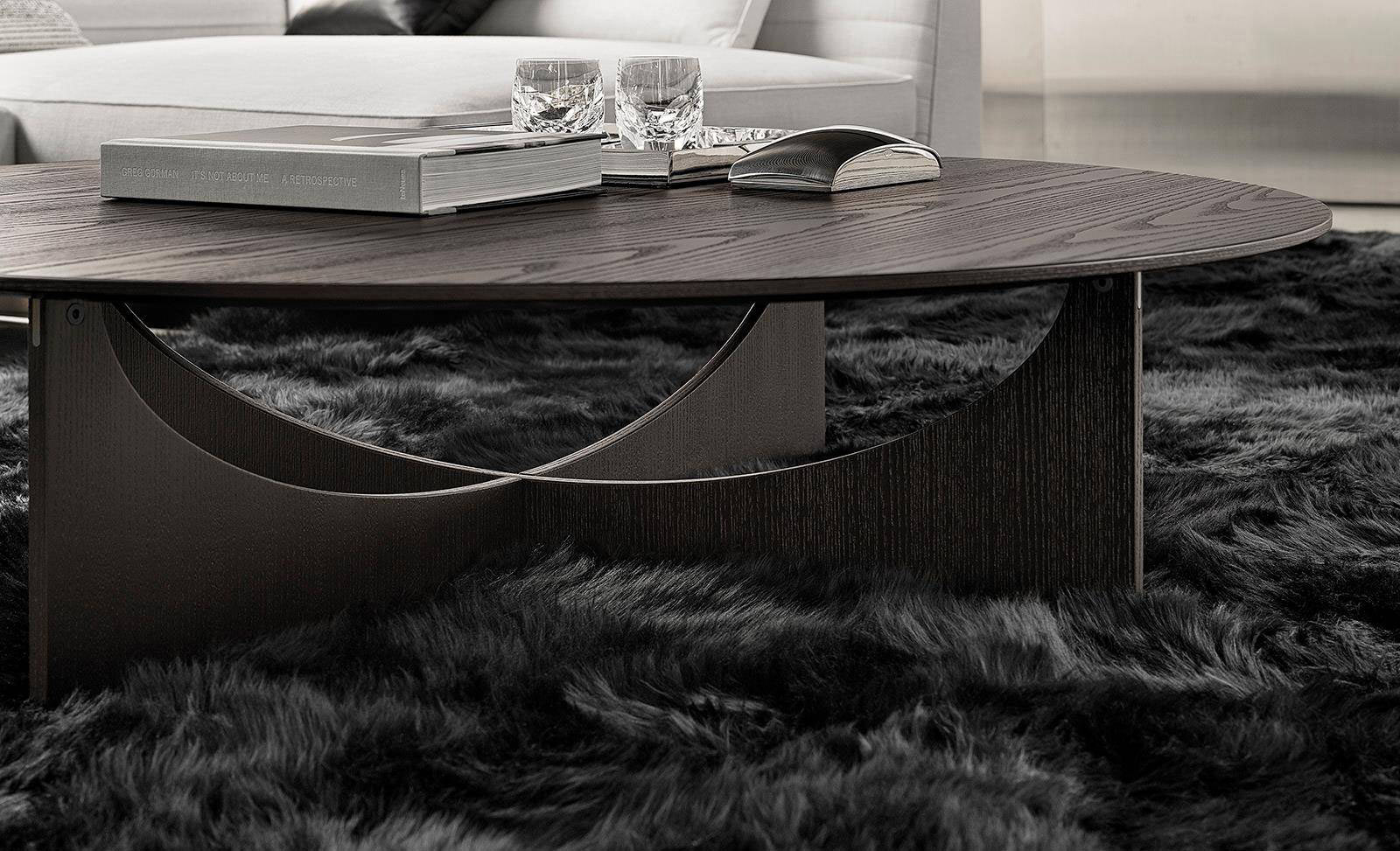 The family also includes little dining and lounge armchairs - only with legs in solid wood - and coffee tables in one size that sit on the iconic X-shaped aluminium base covered in ash with a Moka varnished finish, with round or square top, in Bianconero marble or brushed ash wood with a Moka open-pore lacquered finish.