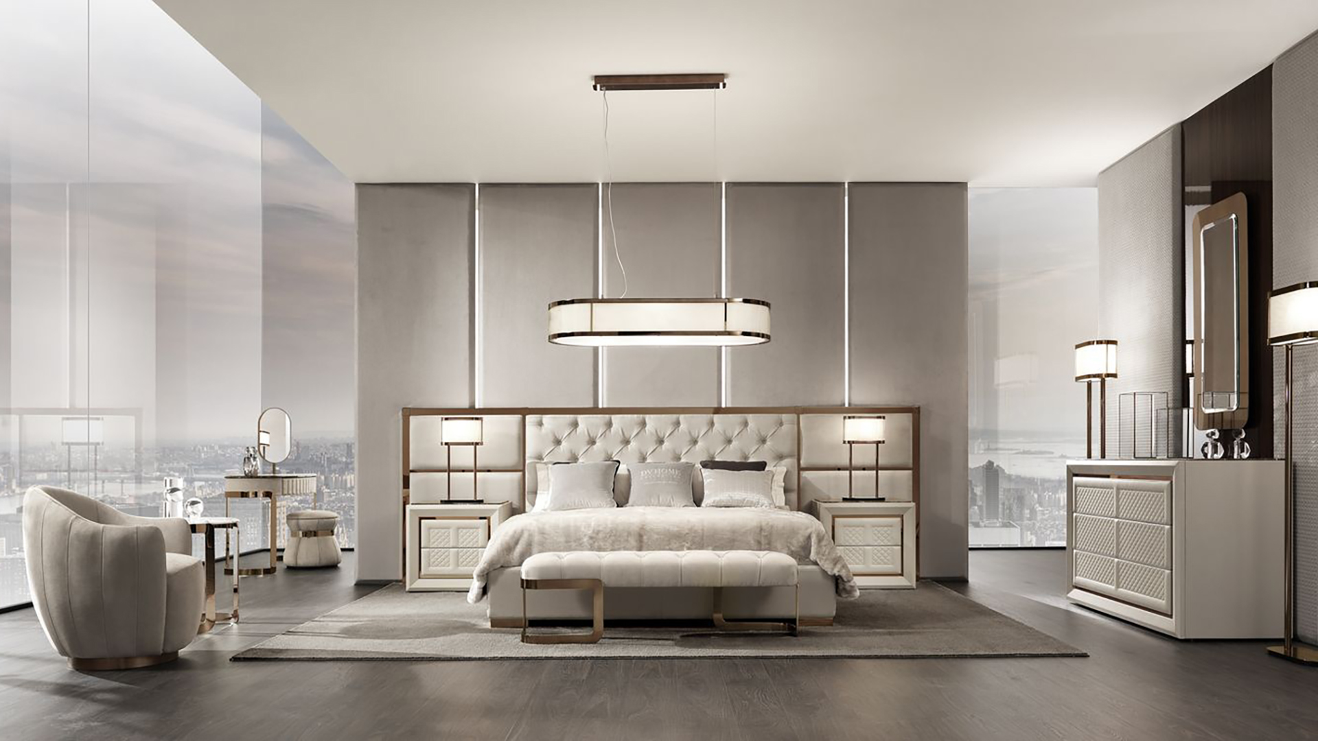 Multi-layer structure covered with leather. Internal part of a covering a opaque varnish. Metal inserts began to repeat. Table top in marble. The quilted frontal system is two-stroke.