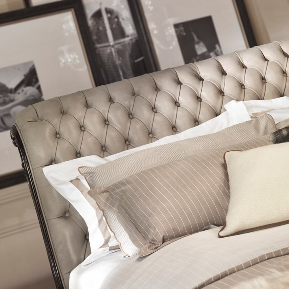 A refined bed with an original headboard characterized by a charming Queen Anne capitonné finishing with leather upholstery. Sinuous and elegant lines emphasized by the swivel front feet and by the new set of linen and cushions.