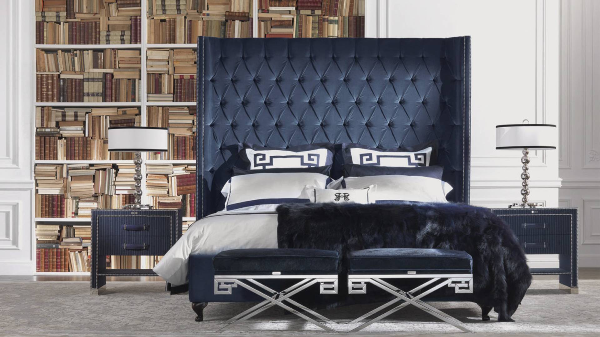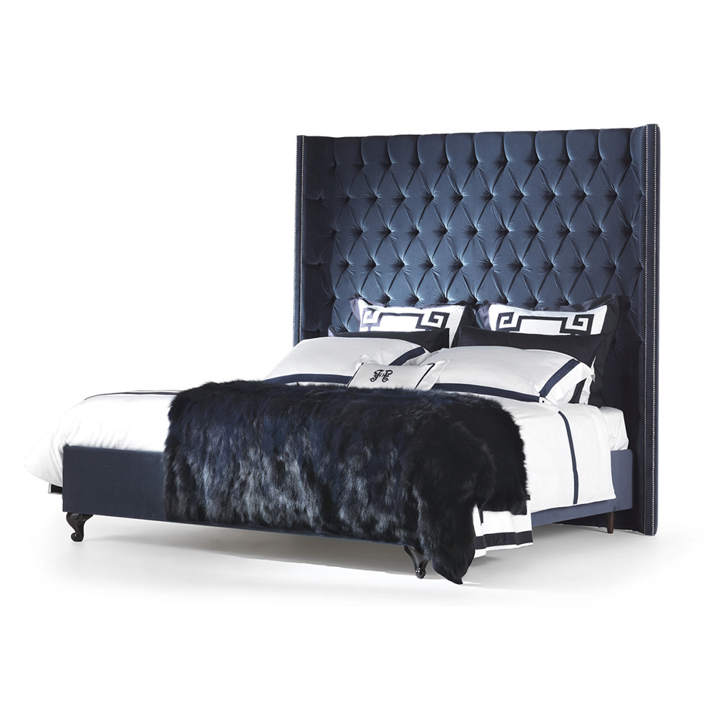 Important and precious, the Bond bed is characterized by the refinement of details. An important and impressive headboard with refined capitonné finishings, studs running along the outer perimeter, Louis XV style feet. All completed by linen and cushions of the Gianfranco Ferré Home Accessories line.