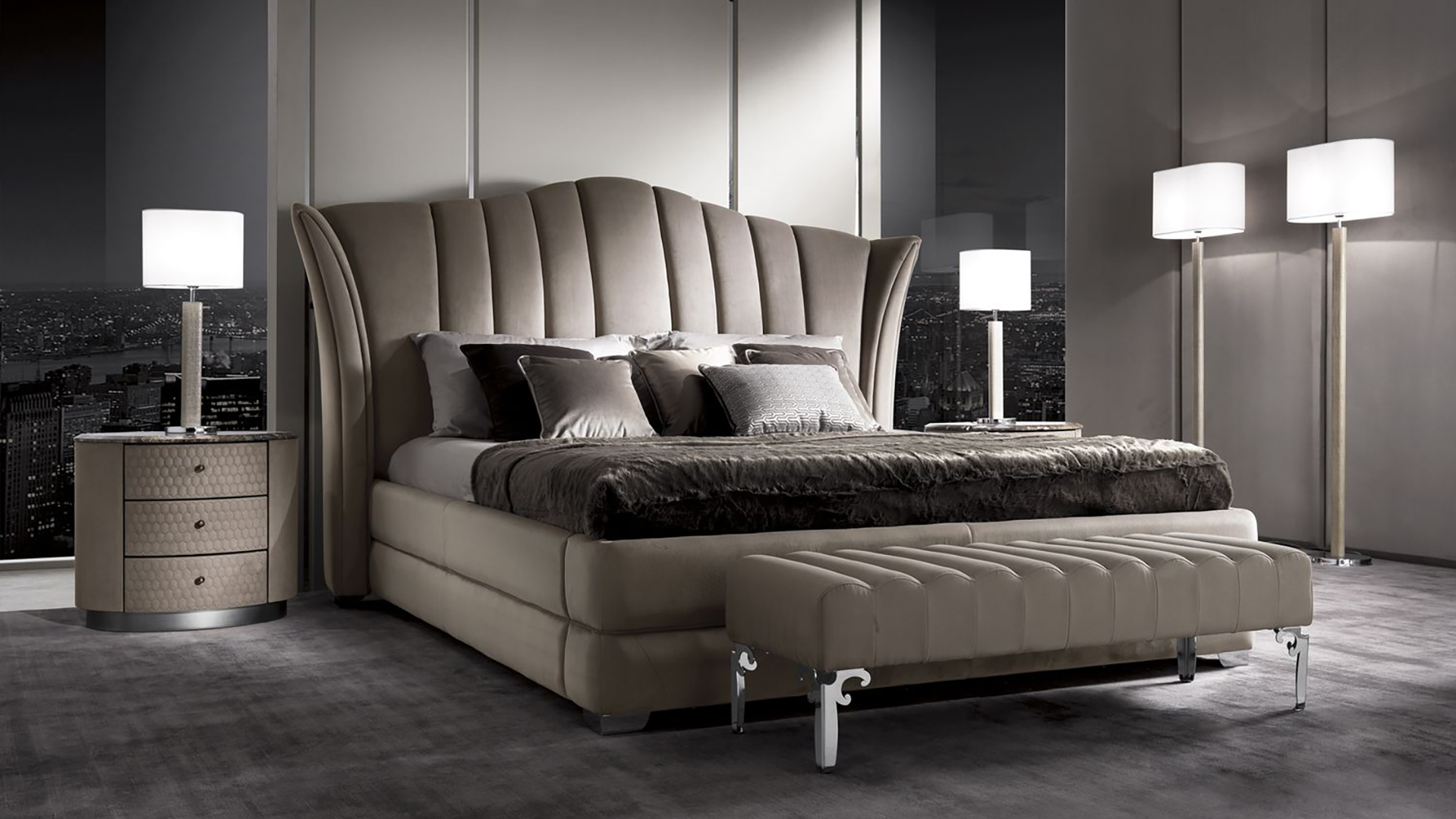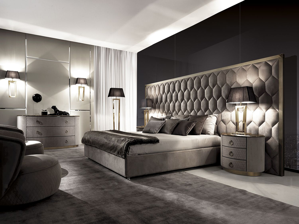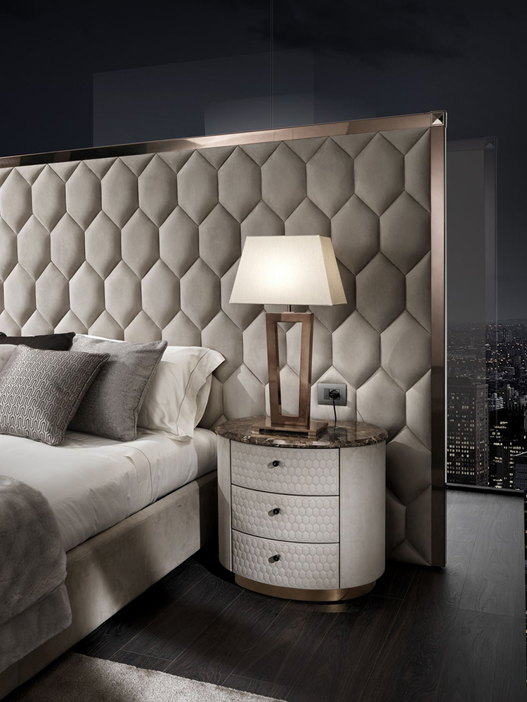 Nightstand with MDF structure and marble top. The base is metal. The lining of the bedside table is made of leather. Various finishes are possible.