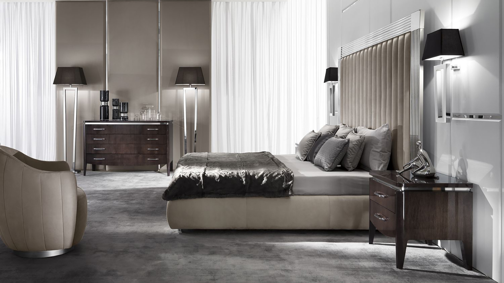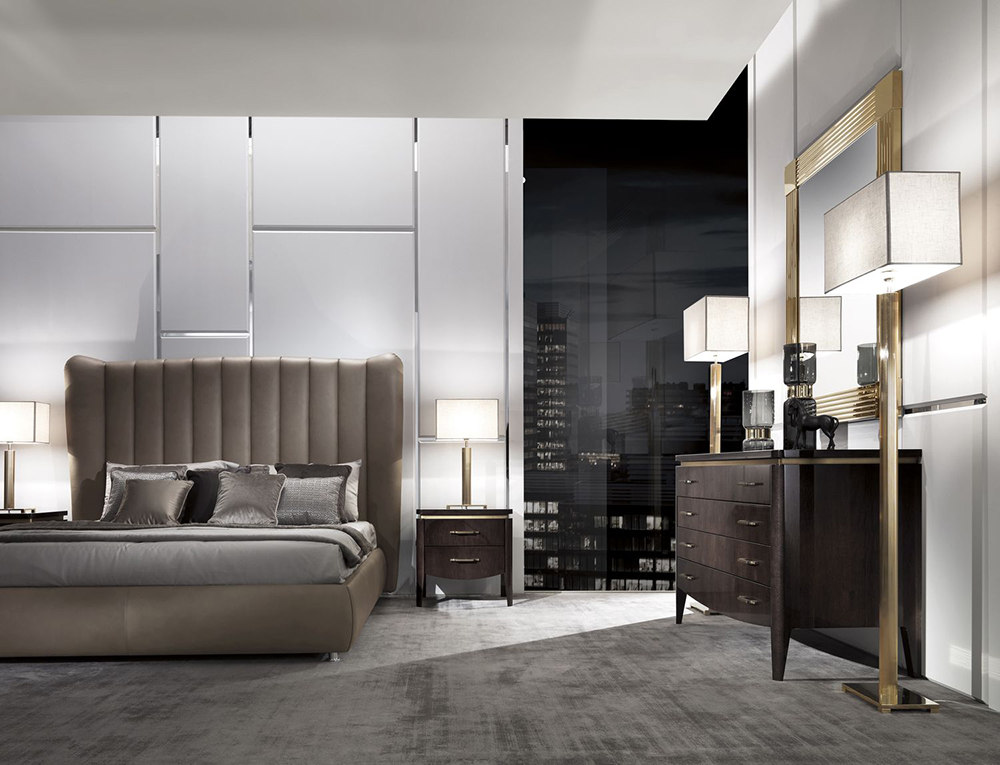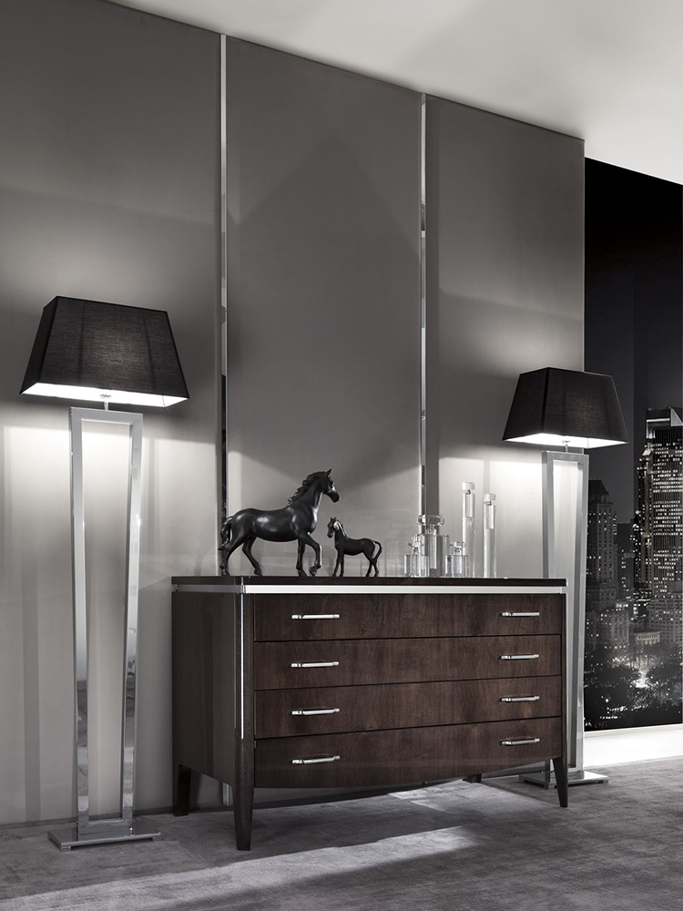 Chest of drawers with four drawers. The frame is made of wood and stainless steel. Various finishes are possible.