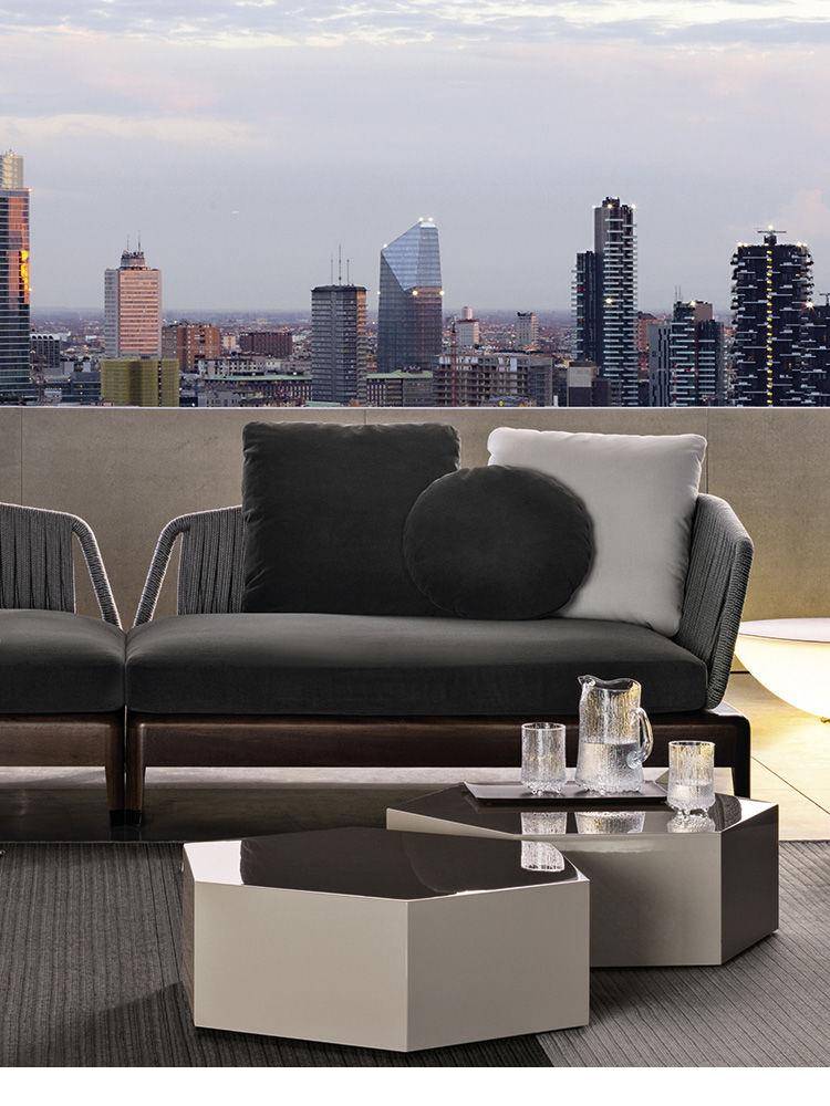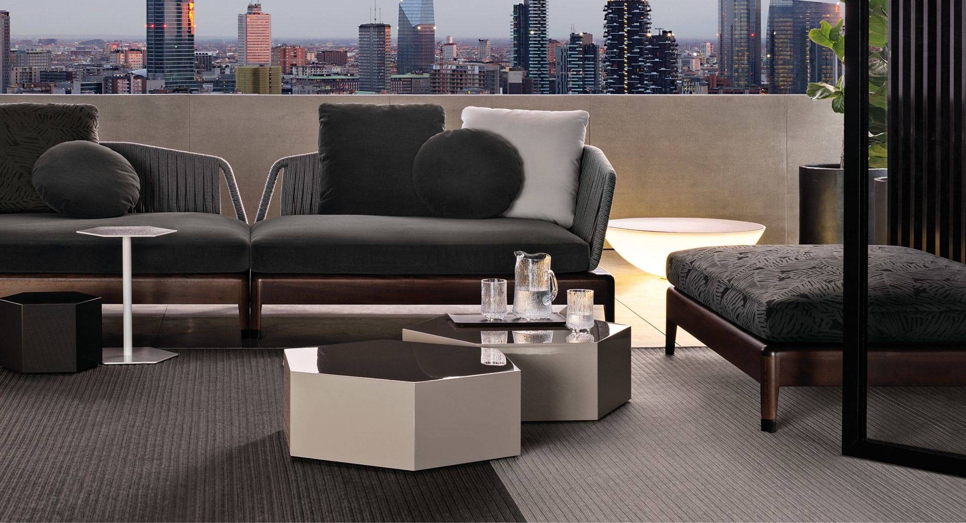 The Aeron “Outdoor” accent tables are available in several sizes, making it possible to create a unique interplay of shapes and sizes. Thanks to their hexagonal prism shape, they forge interesting connections with other types of coffee tables in the collection, especially with the Brisley “Outdoor” accent table.