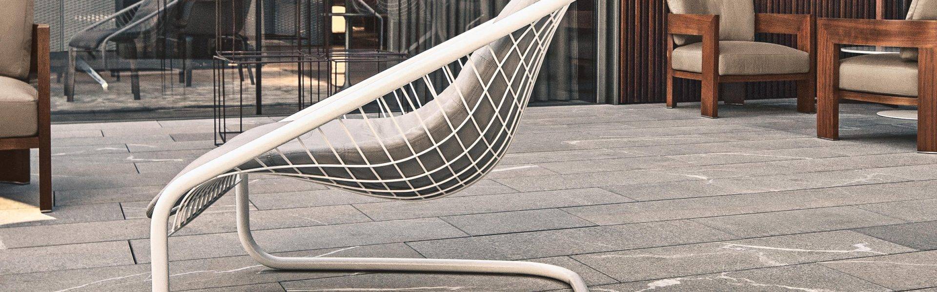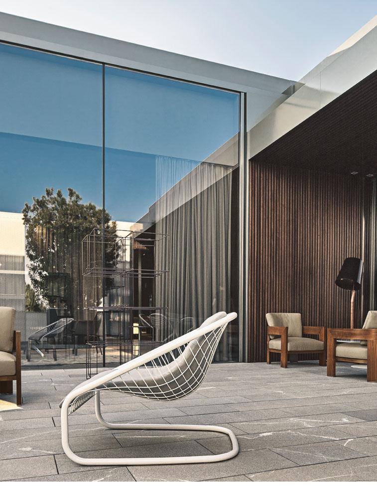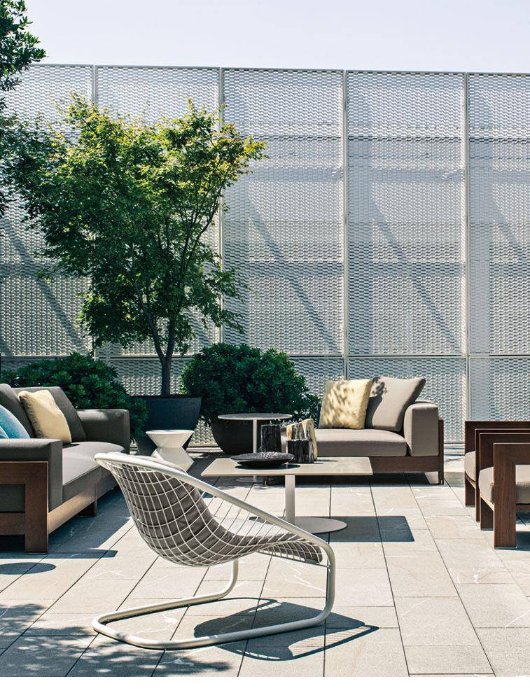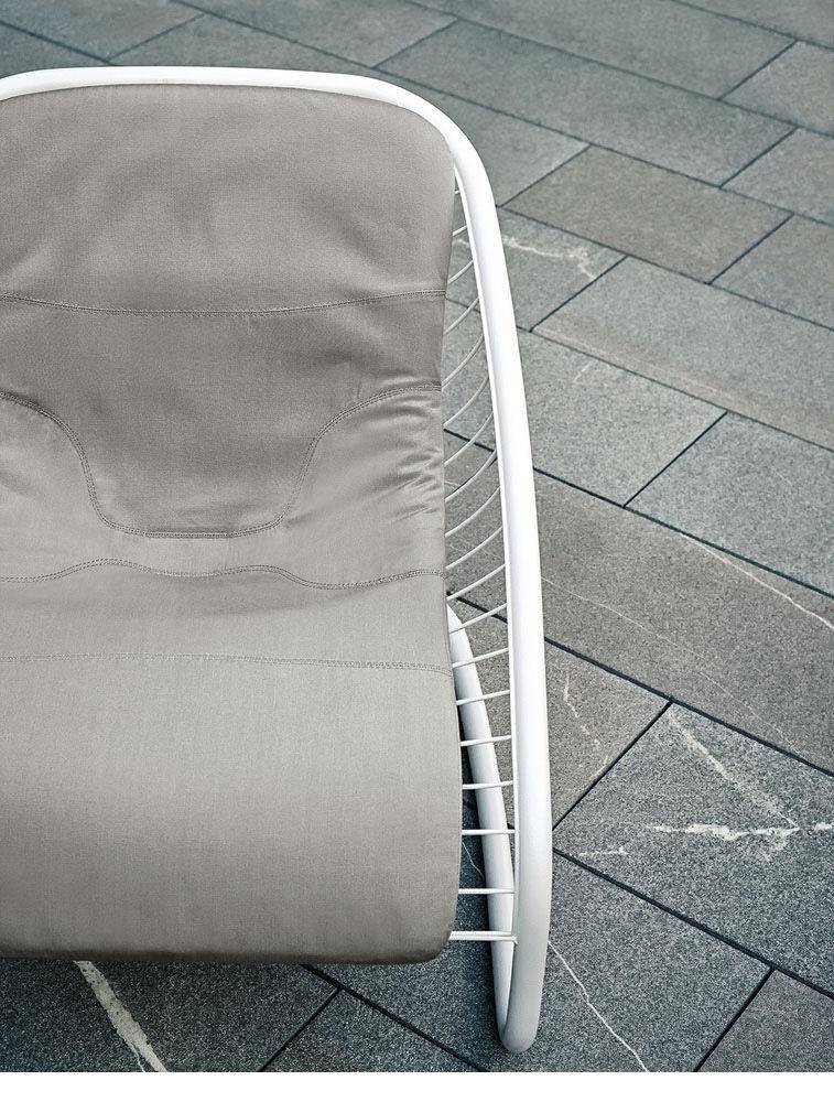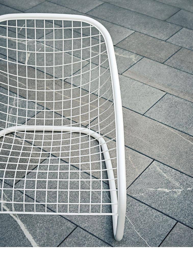The Cortina armchair, launched in 2005, has become an iconic expression of Minotti style. Its wire mesh frame is so lightweight is seems to defy gravity, and now it takes on a new personality, thanks to the introduction of a white painted finish with bush-hammered texture. This new version of the Cortina armchair considerably expands its range of possible uses, both inside the home -- offering a variety of pairing options with all the sofas in the Minotti collection; as well as outside -- in tandem with the Alison Iroko Outdoor sofa. The dynamic shape of the frame and the unusual texture of the Cortina Outdoor sofa form a welcoming background for backrest cushions specifically modified for superior attachment to the frame. All the cushions are covered in white cotton canvas, treated with waterproof coating. The completely removable upholstery fabric comes in an exclusive range of fabrics and colors, tested for their ability to withstand outdoor conditions.