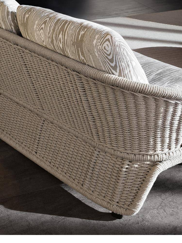 The metal structure is first sandblasted to remove any imperfections and then epoxy powder-coated in the following colors: Clay, Pewter, Sunflower, Khaki Green and Rust. The metal structure is completely covered in special polypropylene fiber that is similar to traditional woven wicker and comes in an array of sophisticated colors: Sand, Elephant Grey, Charcoal, Sunflower, Khaki Green and Rust. The epoxy-painted finish on the metal structure is color-coordinated to match the cord. It is in Pewter color when the cord covering is in Elephant Grey or Charcoal, and is in the same shade as the cord for the other colors: Clay, Sunflower, Khaki Green and Rust. The cushions have internal padding in high resilience expanded polyurethane foam and are covered in water resistant fiber and fabric. The completely removable upholstery covers come in a vast array of outdoor fabrics that look sensational when combined with the cord structures.