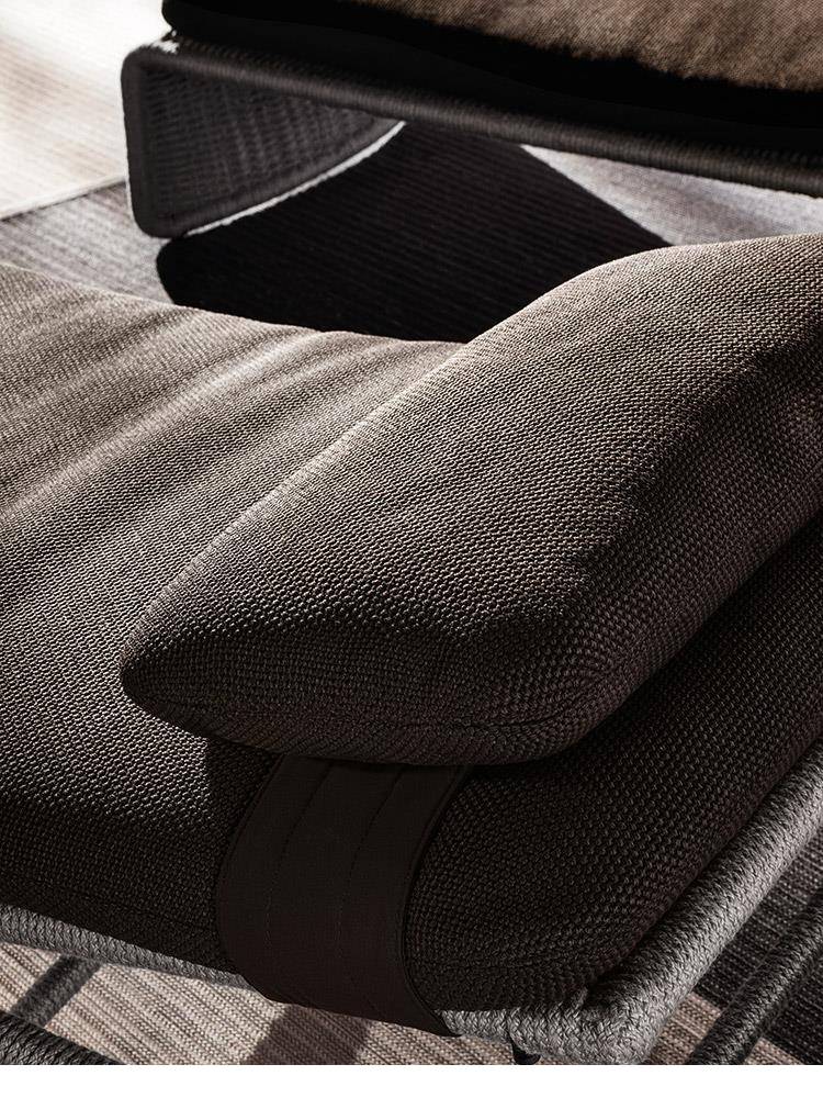 The Halley “Outdoor” collection also includes a daybed that is as elegant as it is comfortable. The structure is covered in cord in the following colors: Sand, Elephant Grey, Charcoal, Sunflower, Khaki Green and Rust. The cushions have internal padding in high resilience expanded polyurethane foam and are covered in water resistant fiber and fabric. Thanks to a mechanism designed and engineered by Minotti Studio, the Halley “Outdoor” daybed can be adjusted to four different reclining positions.