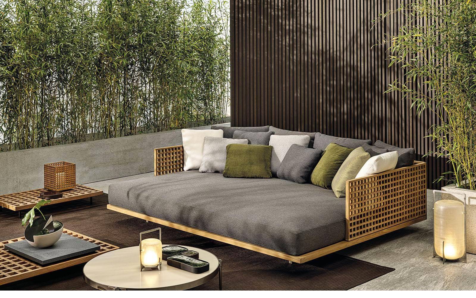 The double daybed sits on two metal crosspieces in Bronze, the finish that links all the elements of the 2019 Outdoor Collection.