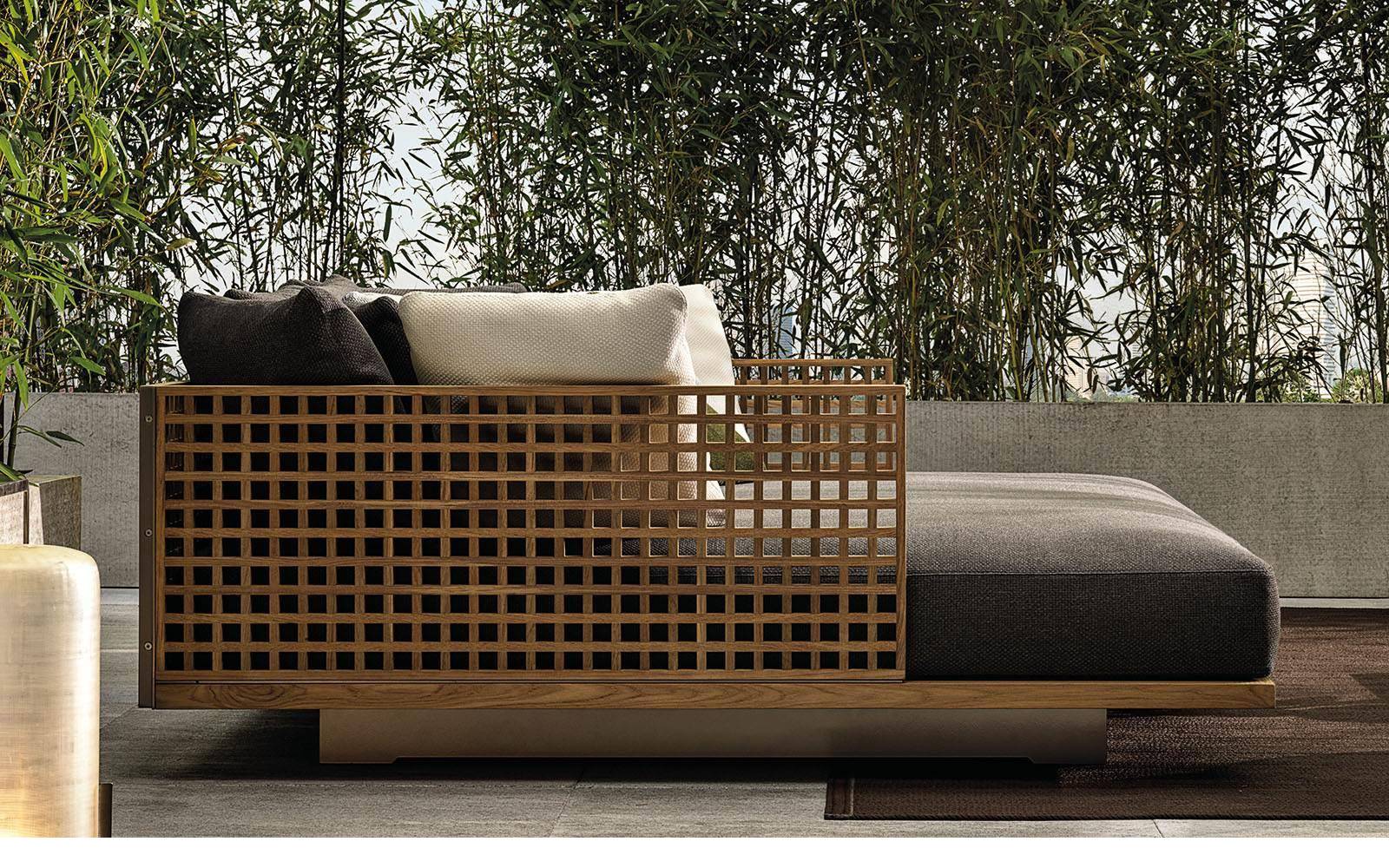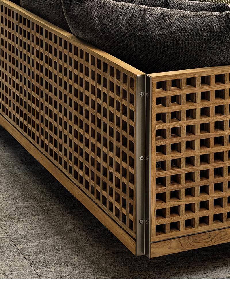 It is designed in the form of a niche, with alcove marked out by the teak duckboard backrest and armrests, and it is completed by a large mattress and soft, enveloping cushions.