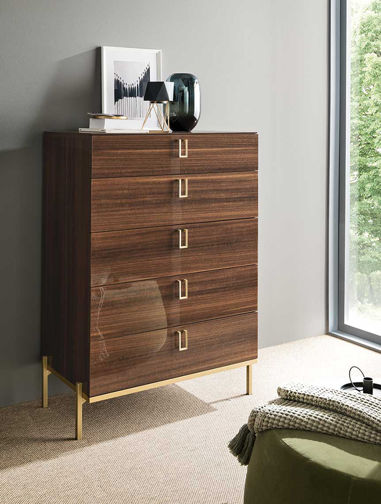 Mid Century Bedroom is made in brown walnut High Gloss lacquer with a perfectly matching golden finish used for the metal parts.