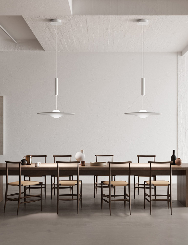Manto expresses its true personality in the reciprocal movement of simple geometries. Thanks to its artisan knowledge and dynamic nature, it changes shape and varies the luminous effect in the space, between wonder and technology.
