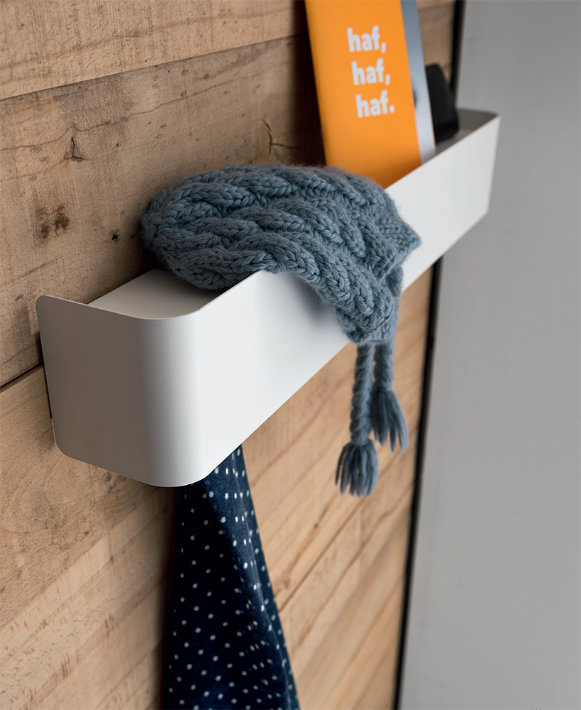 Bumper is an ingenious and ironic furnishing accessory that can be used as coat rack and as shelf or tray at the same time: its curved metal structure conceals 4 hooks in the lower part and a shelf/tray on the top where you can hold small objects, for example those that you want to have within reach when returning or leaving home. It was conceived as furnishing idea for halls, but it can also prove to be useful in any other corner of the home: in living areas, bedrooms and even kitchens or bathrooms.