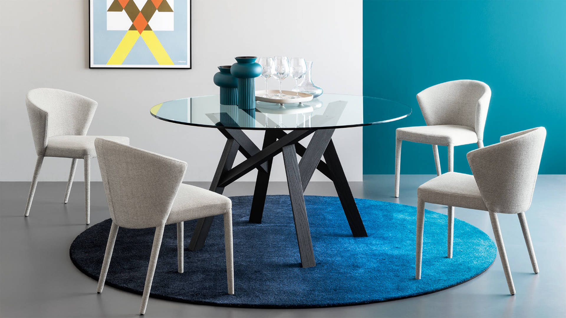 Amelie is a chair with smooth lines, and a unique and contemporary design. The large wrap-around backrest and the seat supported by elastic belts guarantee maximum comfort and softness.