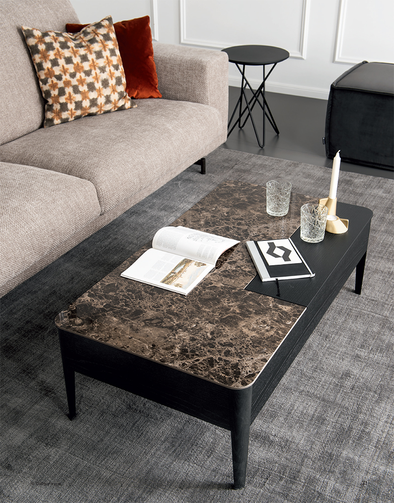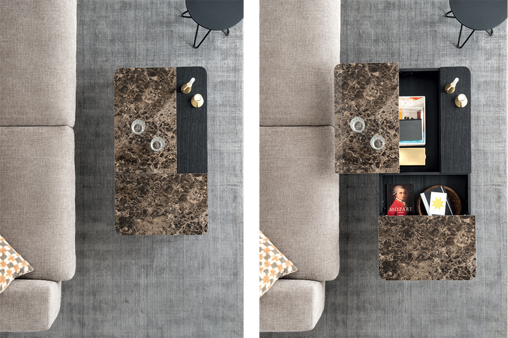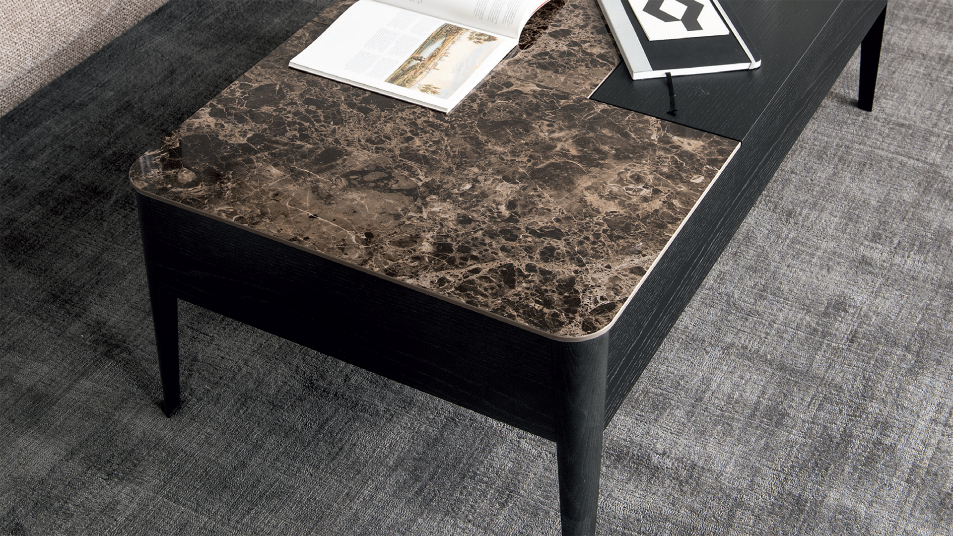 In addition to being a handy tabletop, this Around coffee table features elegant ceramic panels which can be pulled up and out, revealing a storage area for treasured belongings. Alternatively, it can be used as a work surface or a snack bar. With its ground-breaking design, this piece puts a new slant on storage space.