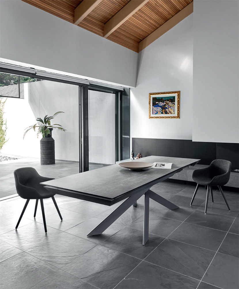 Eclisse is an extending table with an original metal base consisting of 4 interlocking V-shaped elements, reminiscent of the game Shanghai.