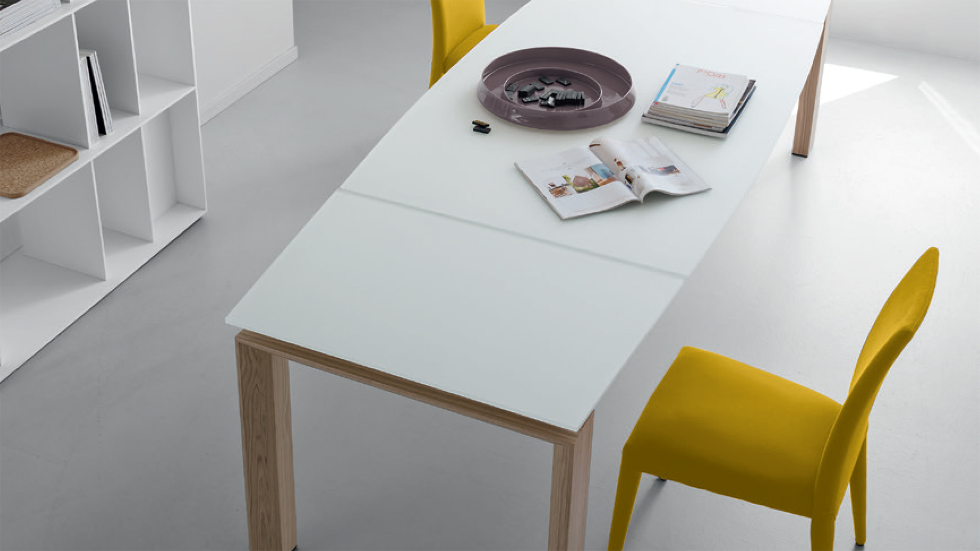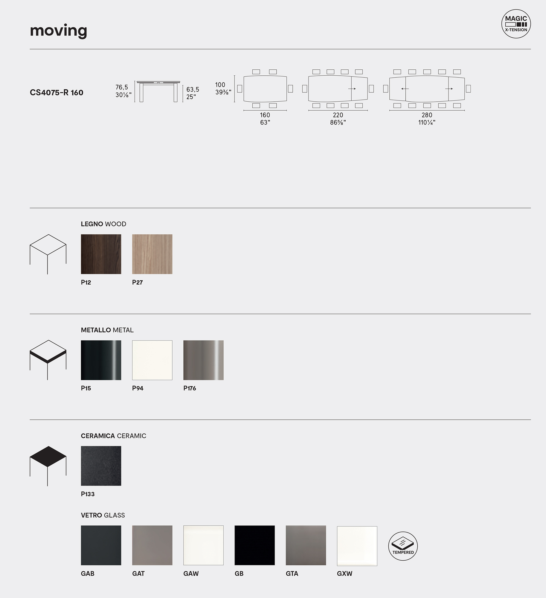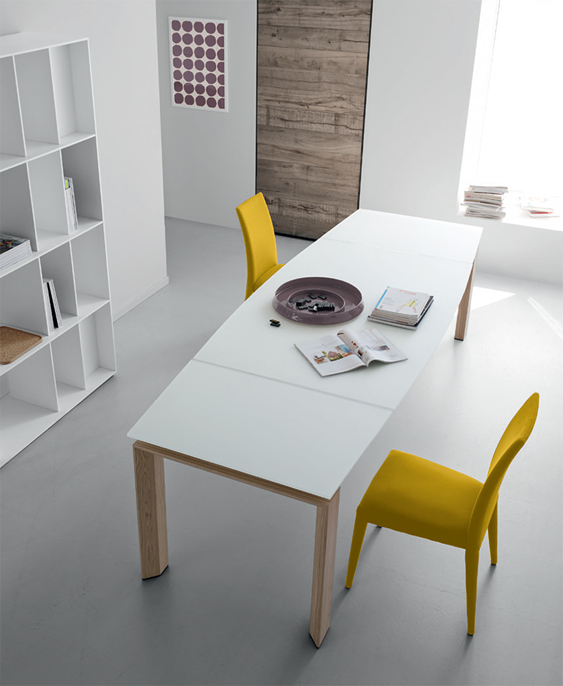 The use of state-of-the-art technology - a patented telescopic extension leaf mechanism - has allowed us to craft a super extending table whose length can be doubled with just a single, practical movement. By pressing the handles on the short end and pulling towards you, the extension leaves slide out from underneath the top in succession and position themselves automatically. The legs, finished in wood or metal, remain at the corners, thus ensuring the utmost comfort to all guests. The multiplicity of materials and finishes available for the Moving table allows a variety of combinations to satisfy any furnishing need.